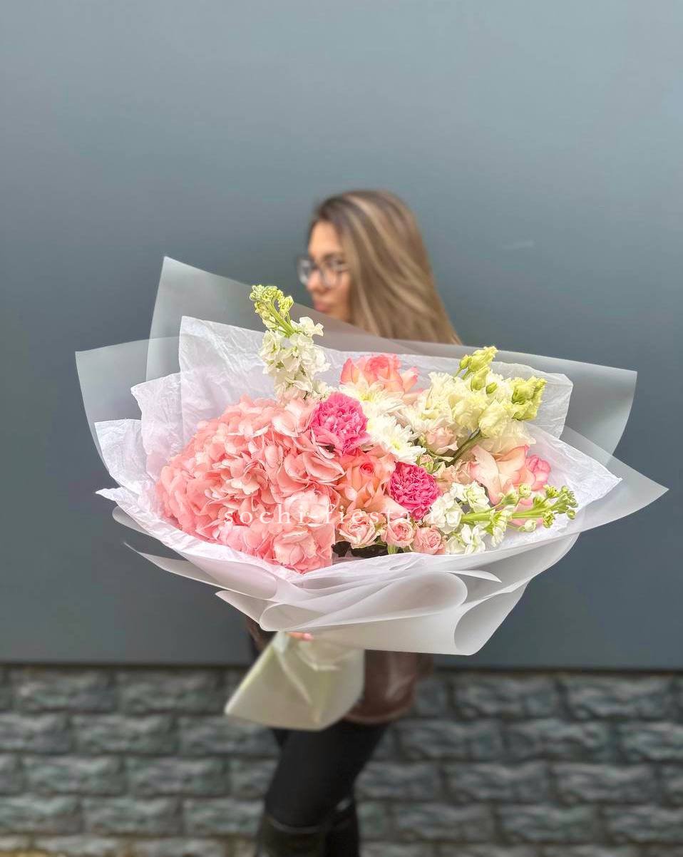 Французские розы распускаются мягкими облаками пудрового оттенка. Лимониум добавляет воздушности, а эвкалипт создает свежую основу. Букет собран так, что каждый бутон виден и дышит.