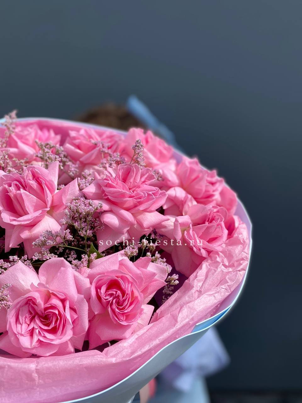 французские розовые розы., лимониум, эвкалипт, лента, дизайнерская пленка.