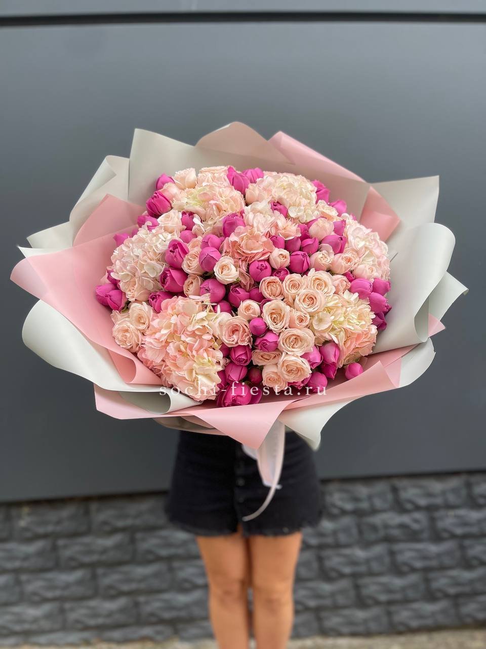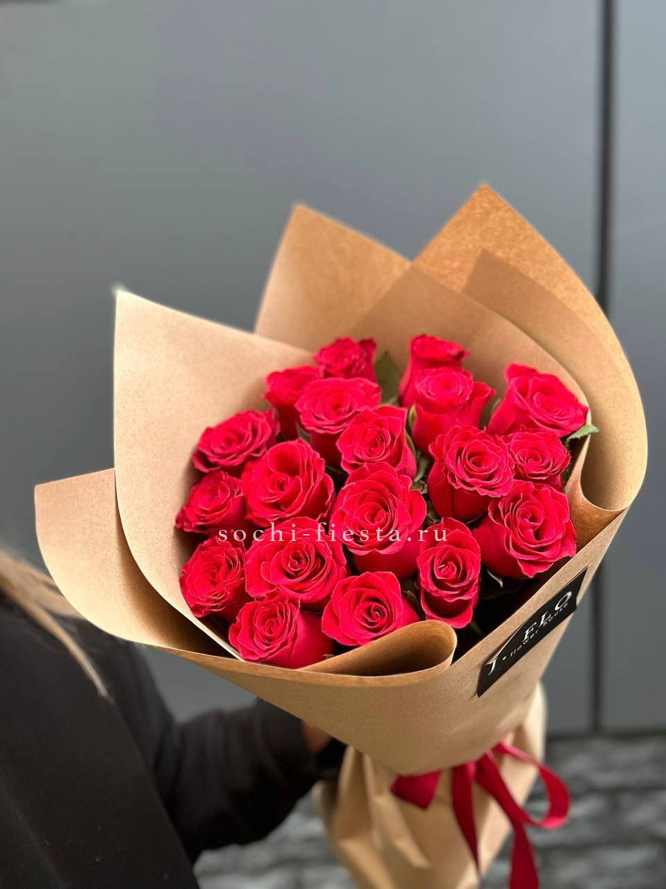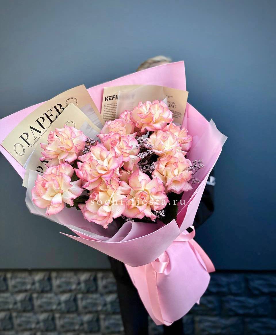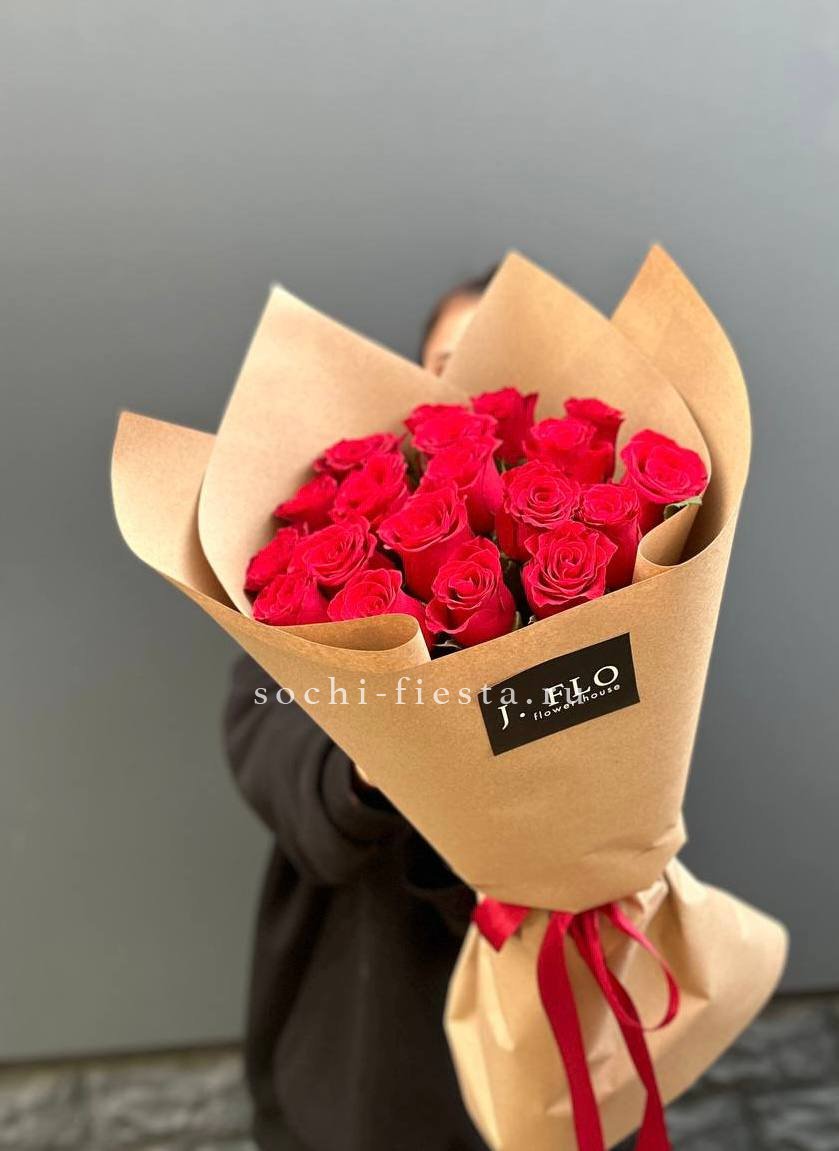 Французские розы Джумилия раскрываются широкими бутонами и формируют яркую композицию из пятнадцати стеблей. Каждый цветок демонстрирует характерную для сорта фактуру с плотными слоями лепестков.