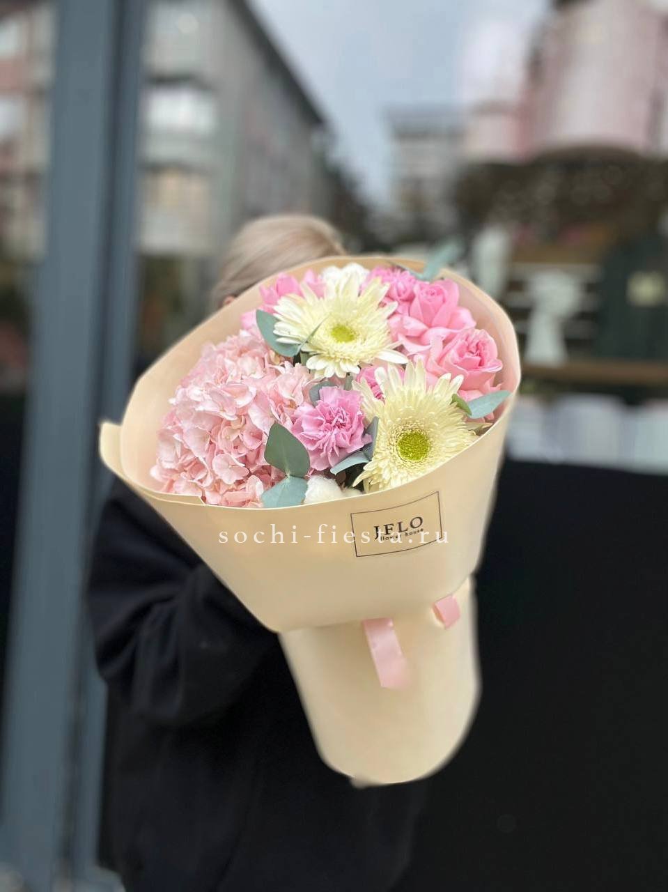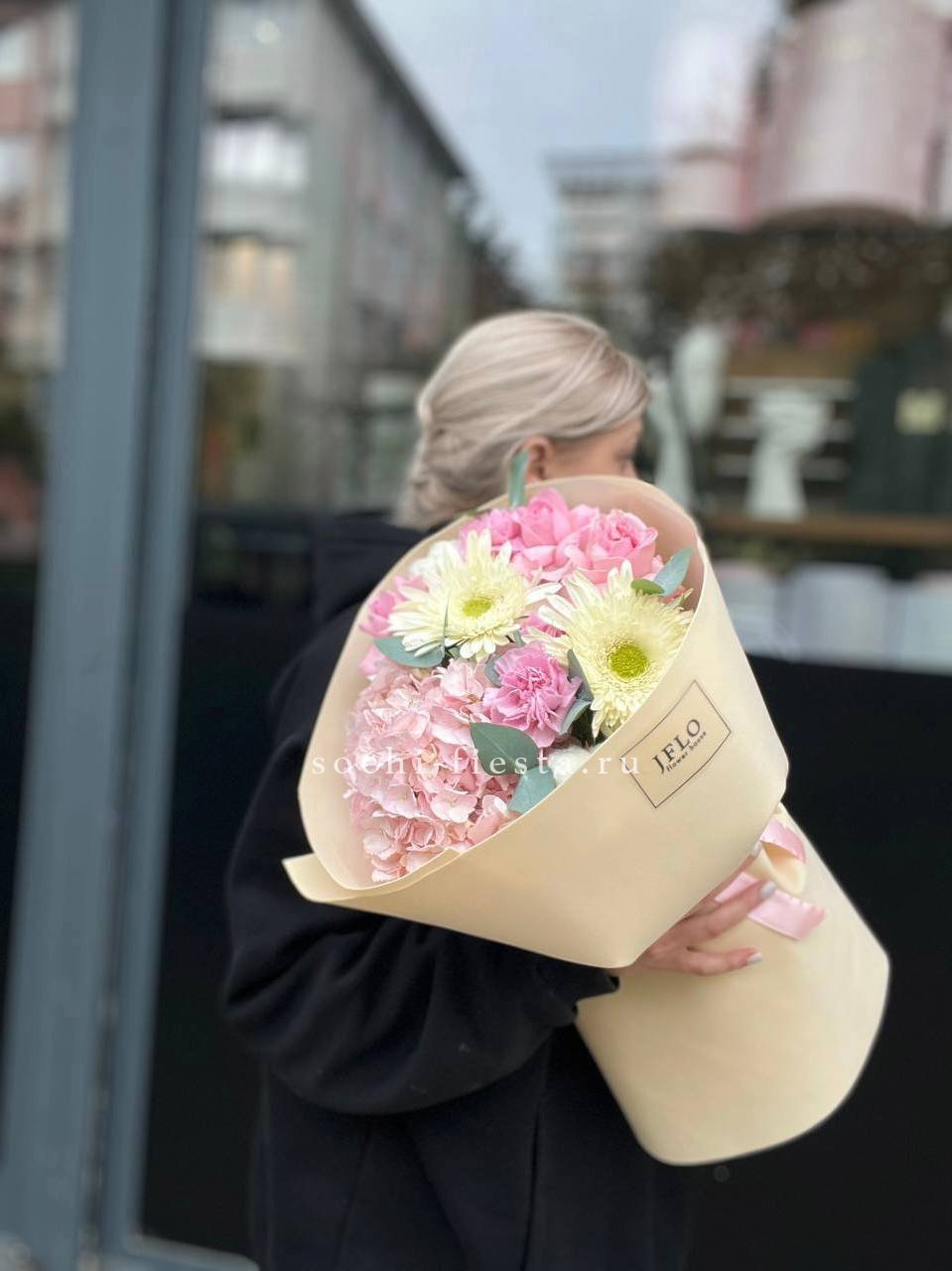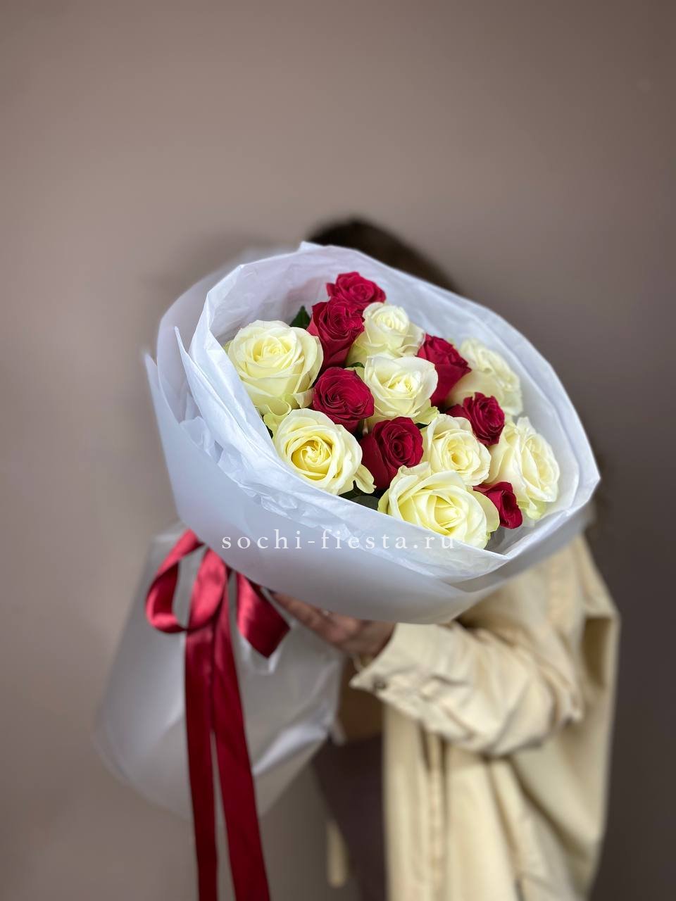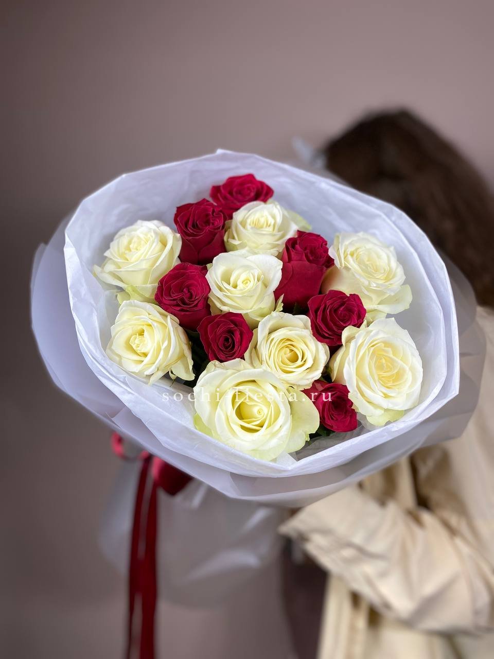 Французские розы Джумилия раскрываются широкими бутонами и формируют яркую композицию из пятнадцати стеблей. Каждый цветок демонстрирует характерную для сорта фактуру с плотными слоями лепестков.