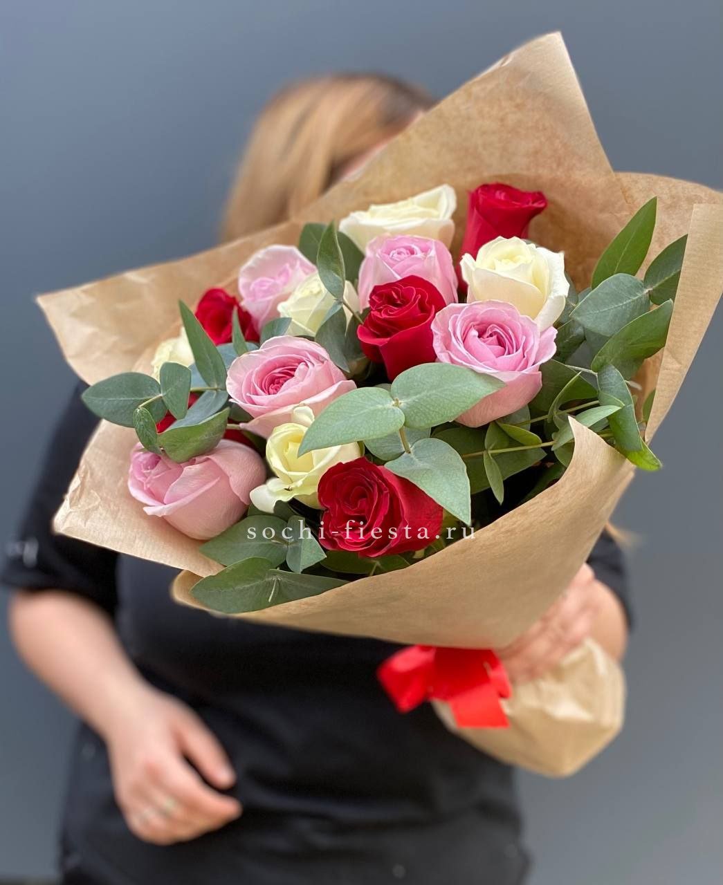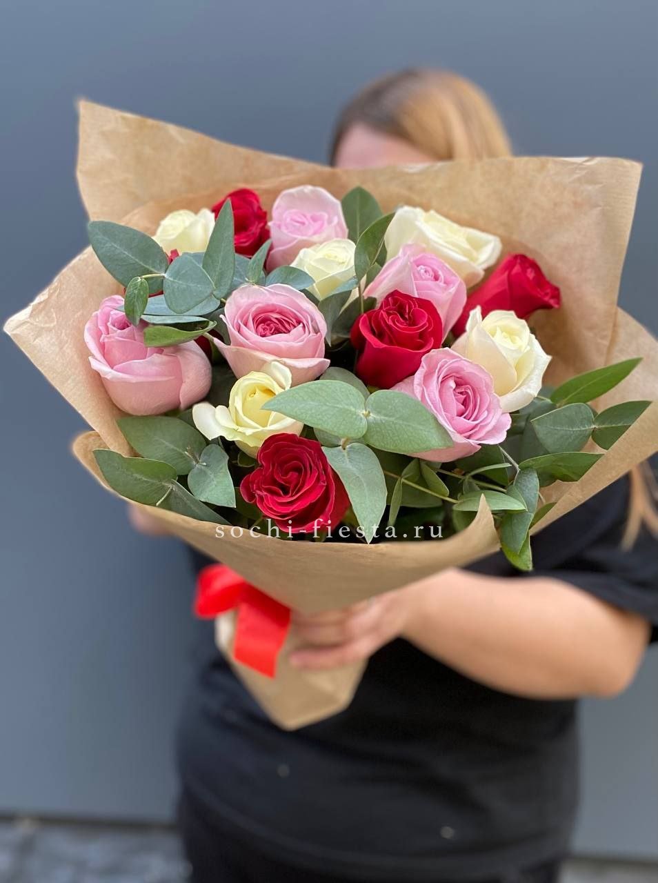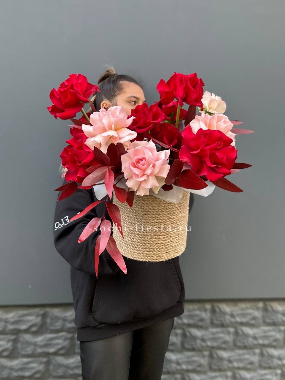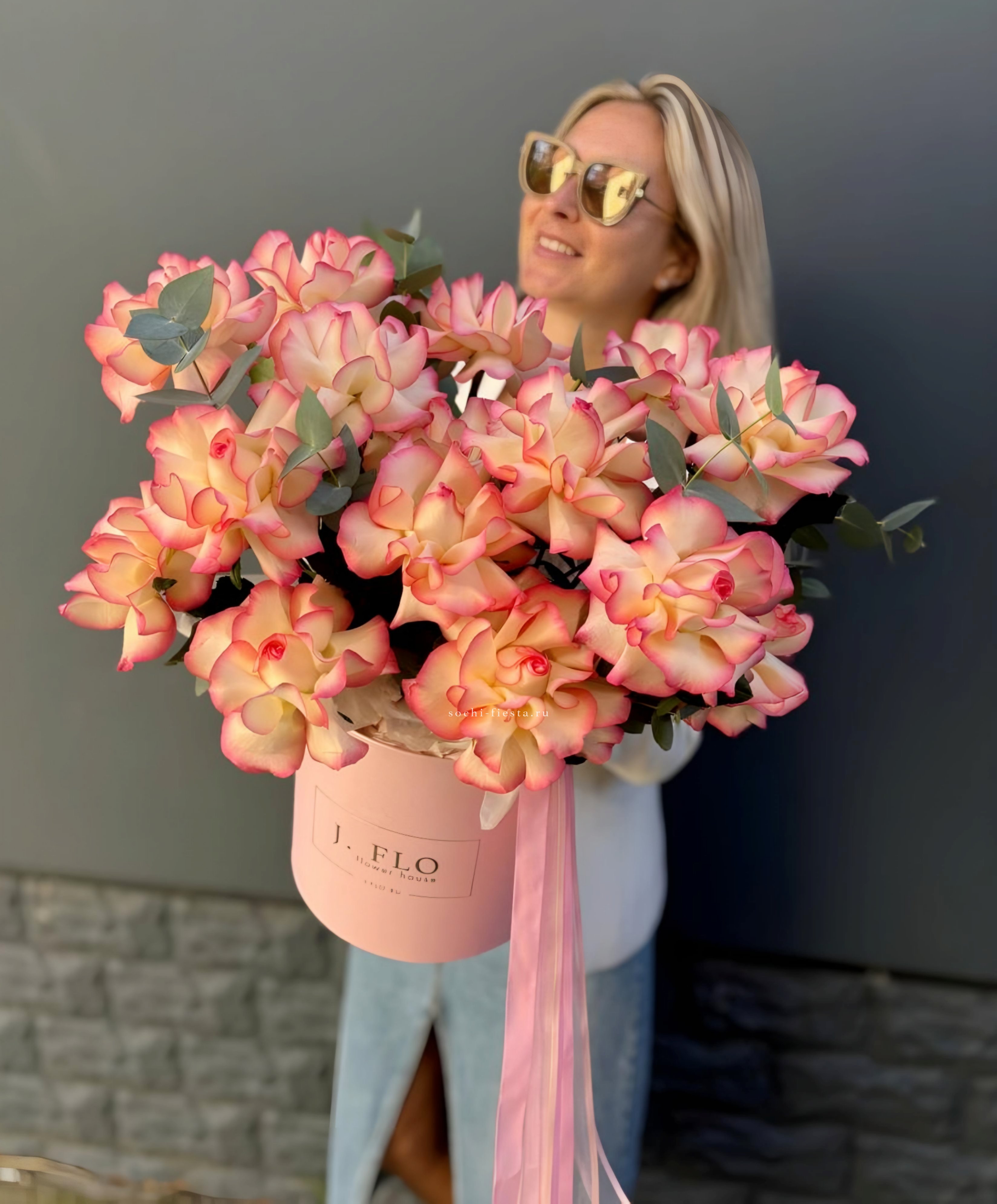 Пятнадцать вывернутых роз Джумилия раскрывают свою многослойную структуру в каждом бутоне. Эвкалипт обрамляет композицию, подчёркивая фактуру лепестков.