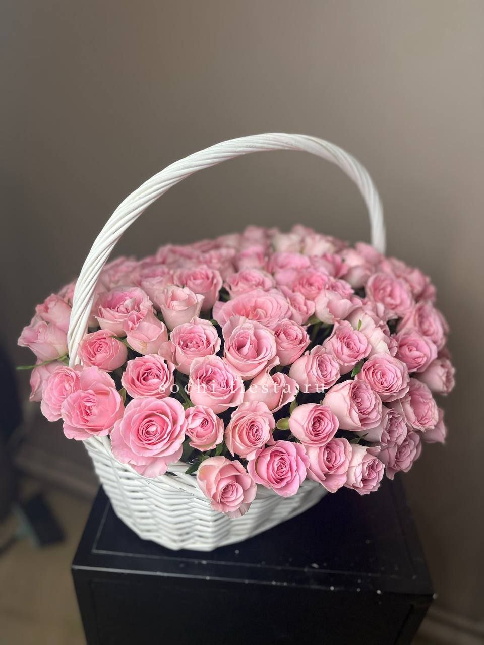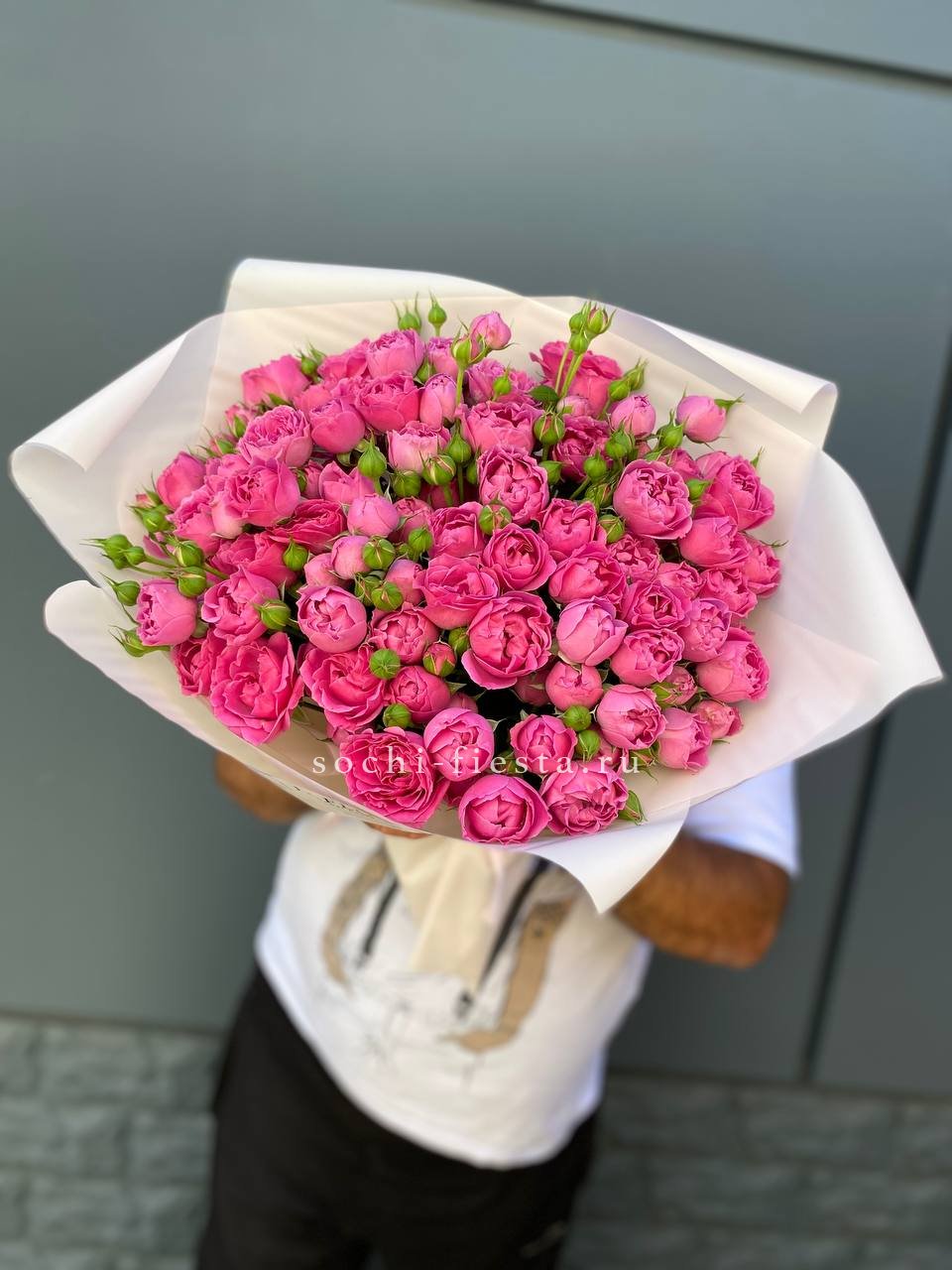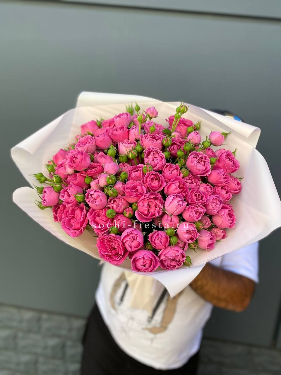 Пятнадцать вывернутых роз Джумилия раскрывают свою многослойную структуру в каждом бутоне. Эвкалипт обрамляет композицию, подчёркивая фактуру лепестков.