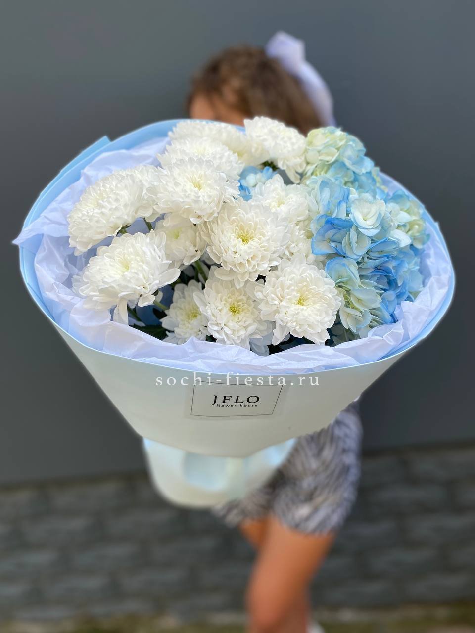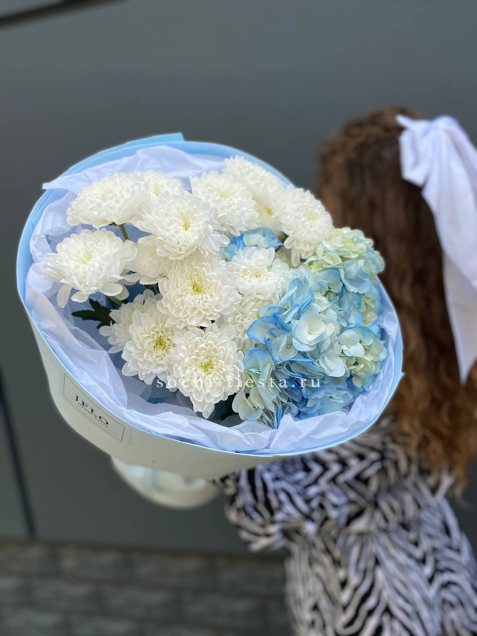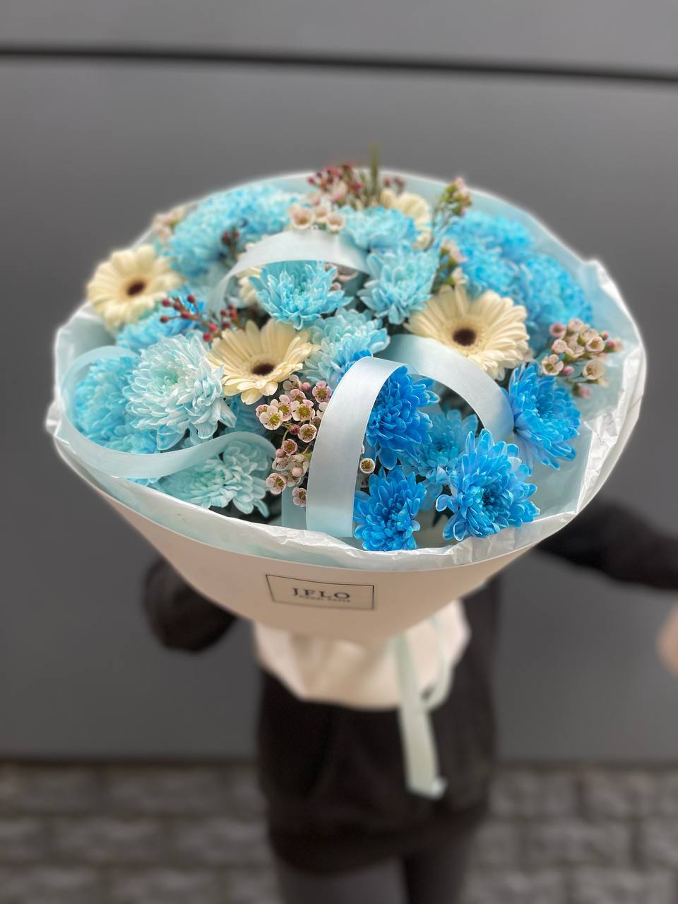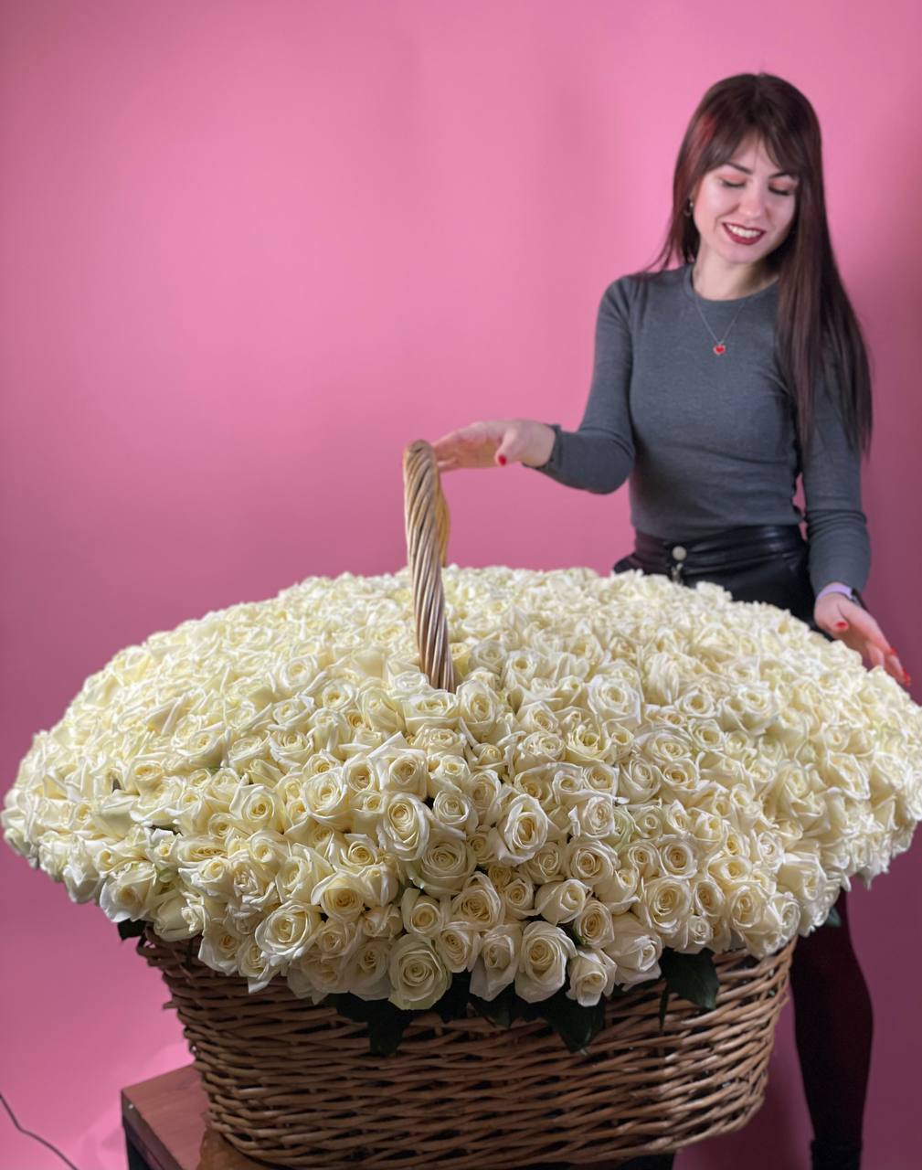 Пятнадцать вывернутых роз Джумилия раскрывают свою многослойную структуру в каждом бутоне. Эвкалипт обрамляет композицию, подчёркивая фактуру лепестков.