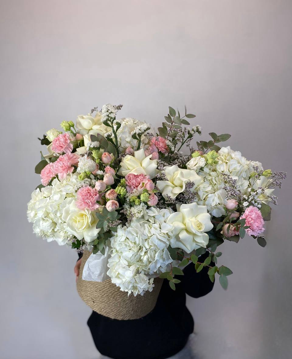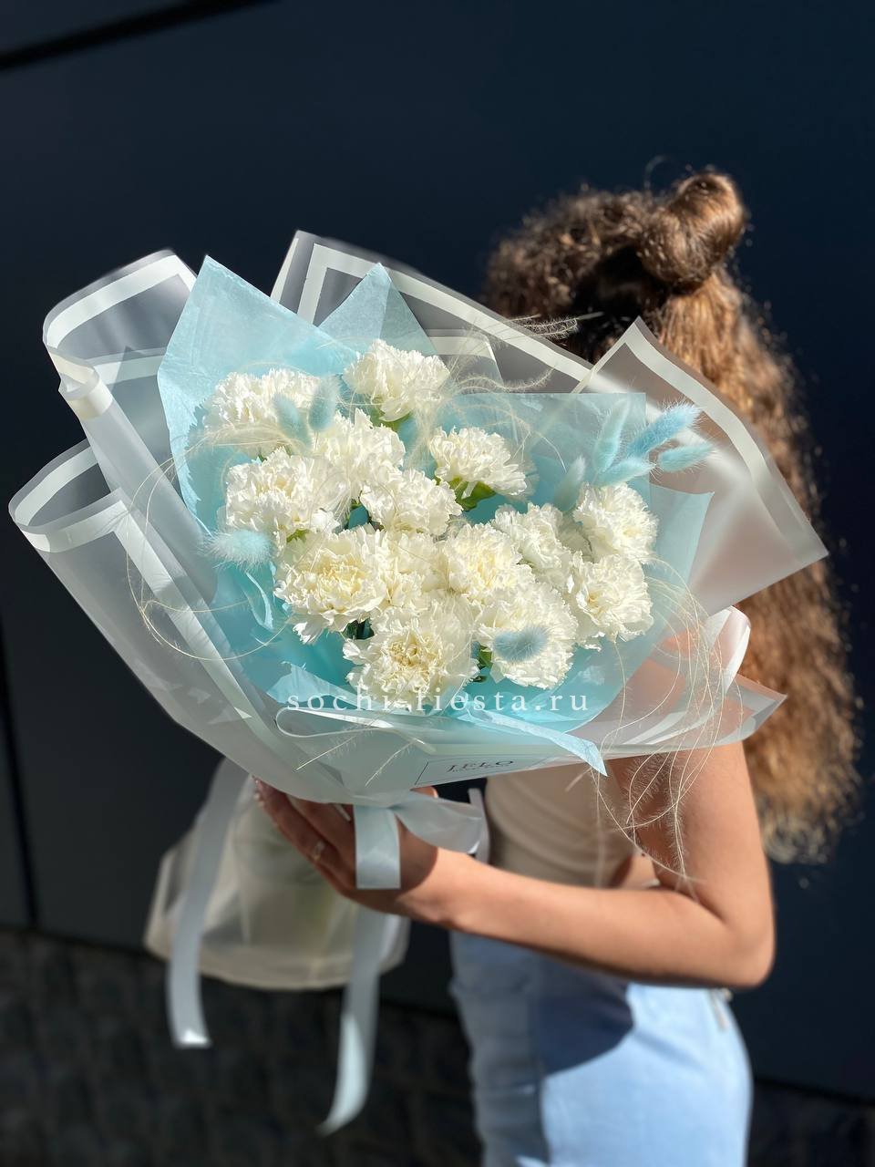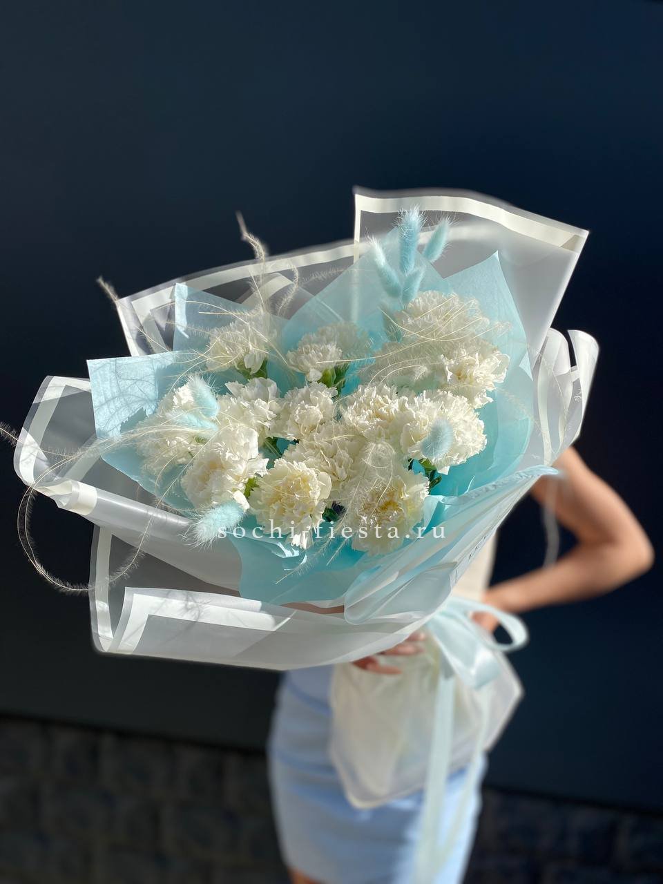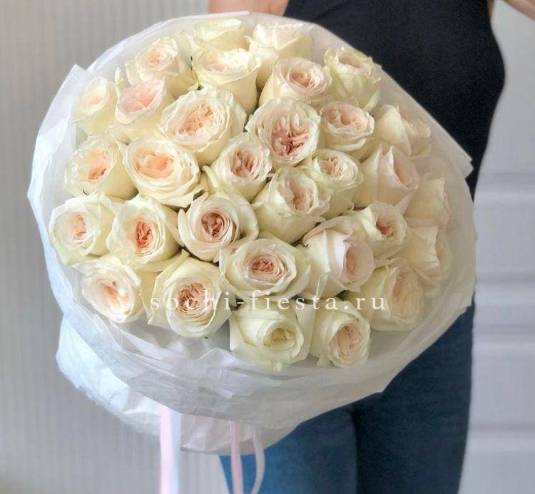 Тридцать пять белых роз образуют объемную композицию с выразительным силуэтом. Светлая упаковка поддерживает воздушность и графичность линий. Впечатляющее присутствие в любом пространстве.