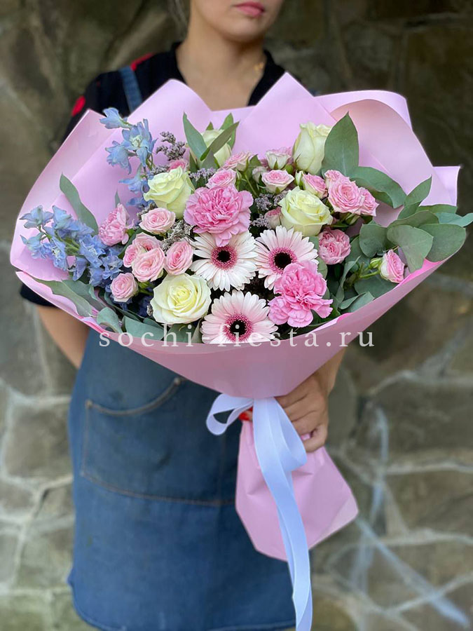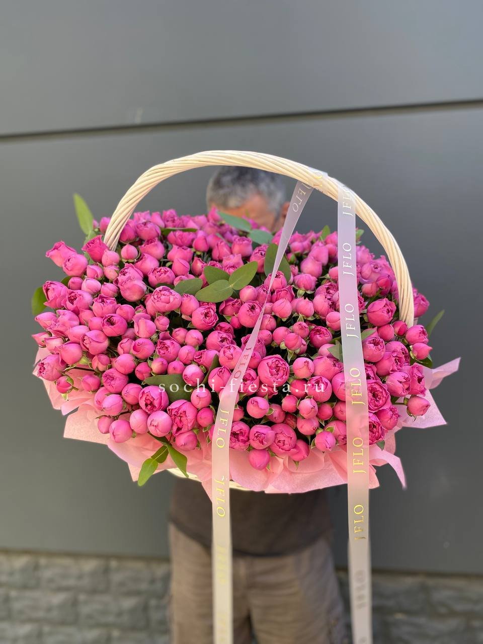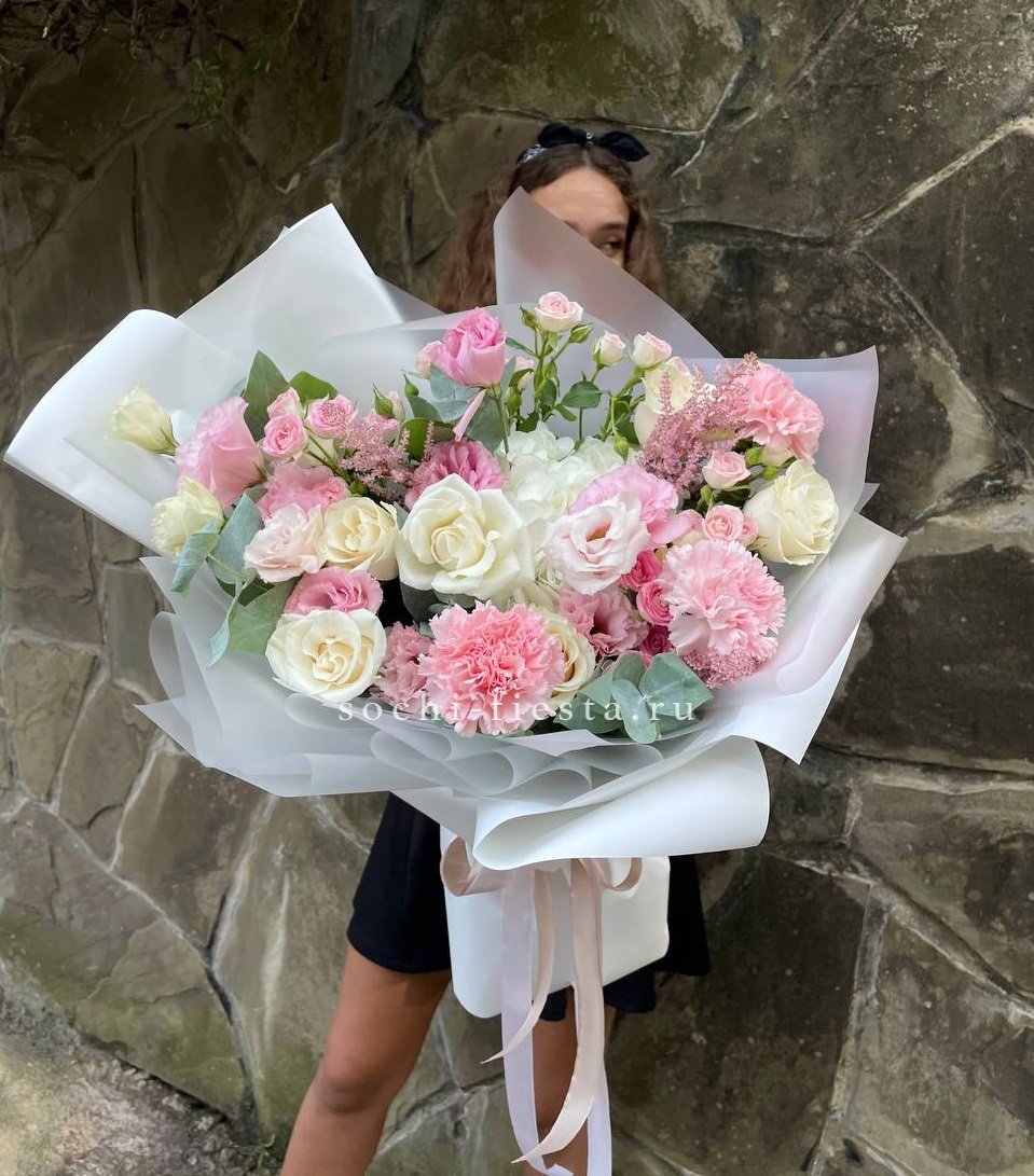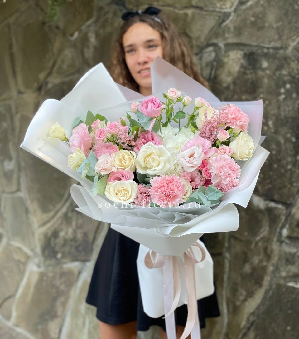 Тридцать пять белых роз образуют объемную композицию с выразительным силуэтом. Светлая упаковка поддерживает воздушность и графичность линий. Впечатляющее присутствие в любом пространстве.