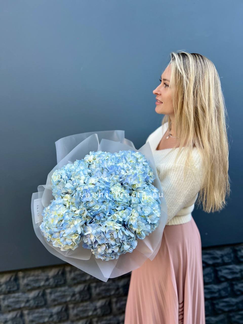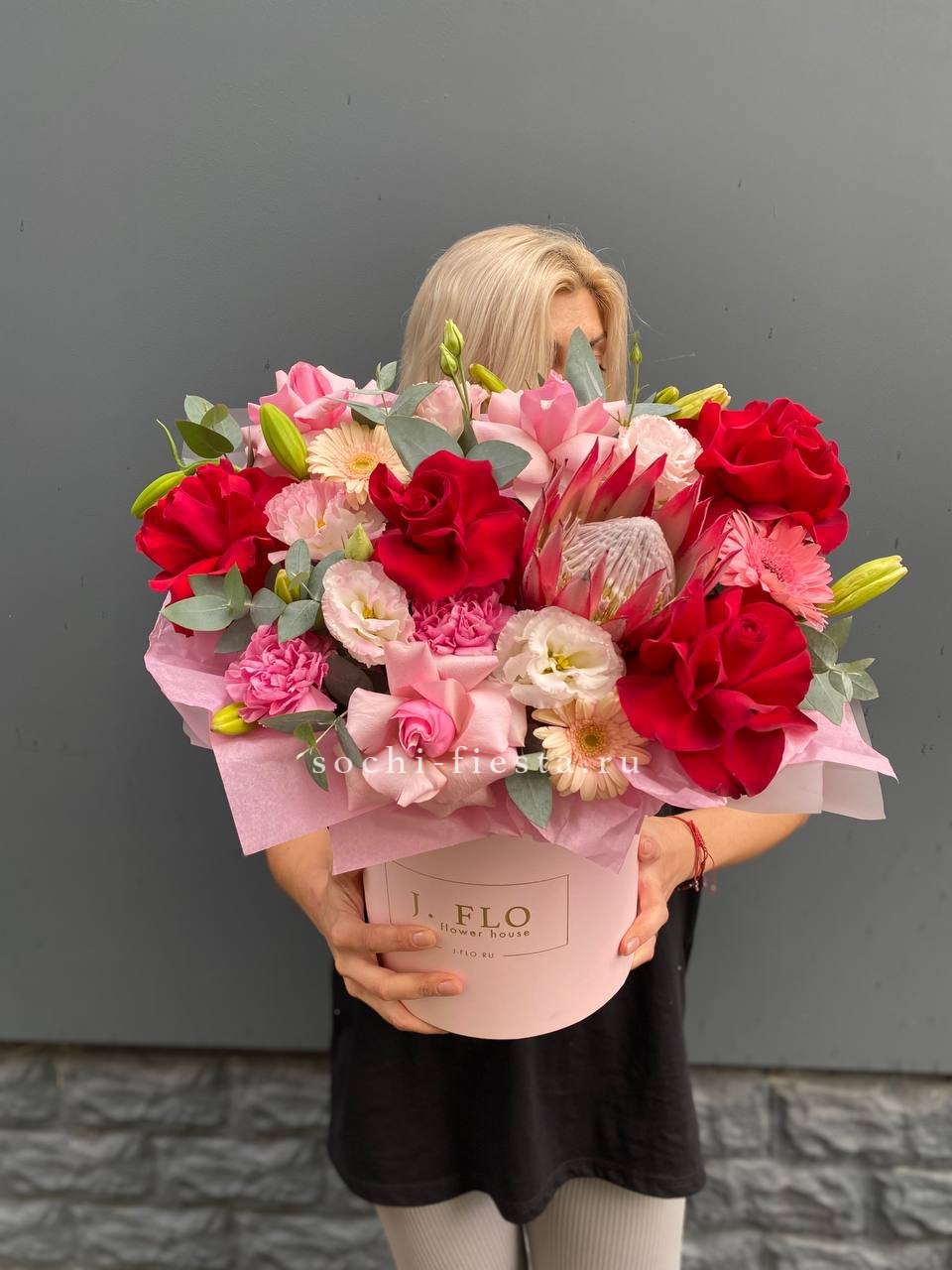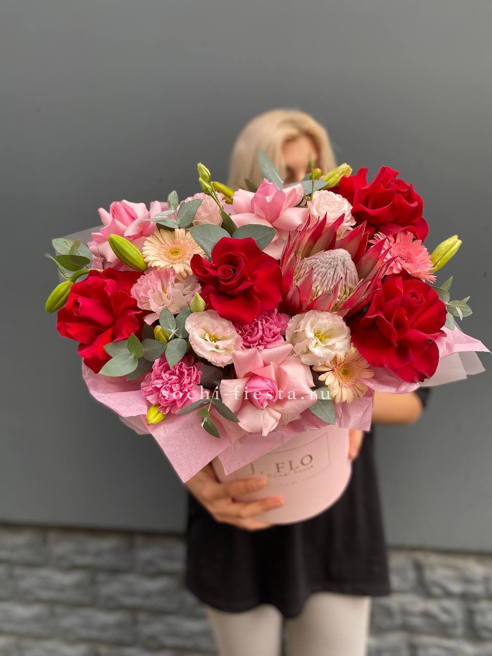 Пять кустовых хризантем собраны в лаконичный букет с мягким обрамлением. Пышные соцветия создают воздушный объем и заполняют пространство легкостью.