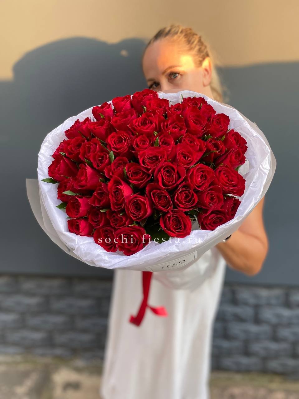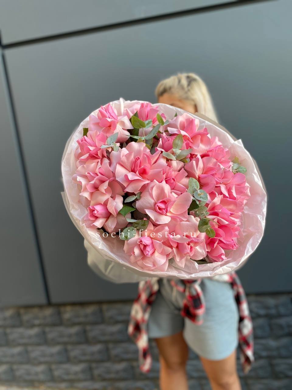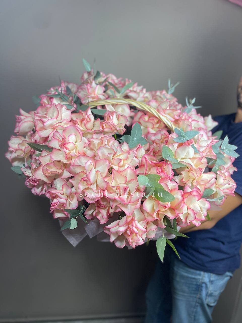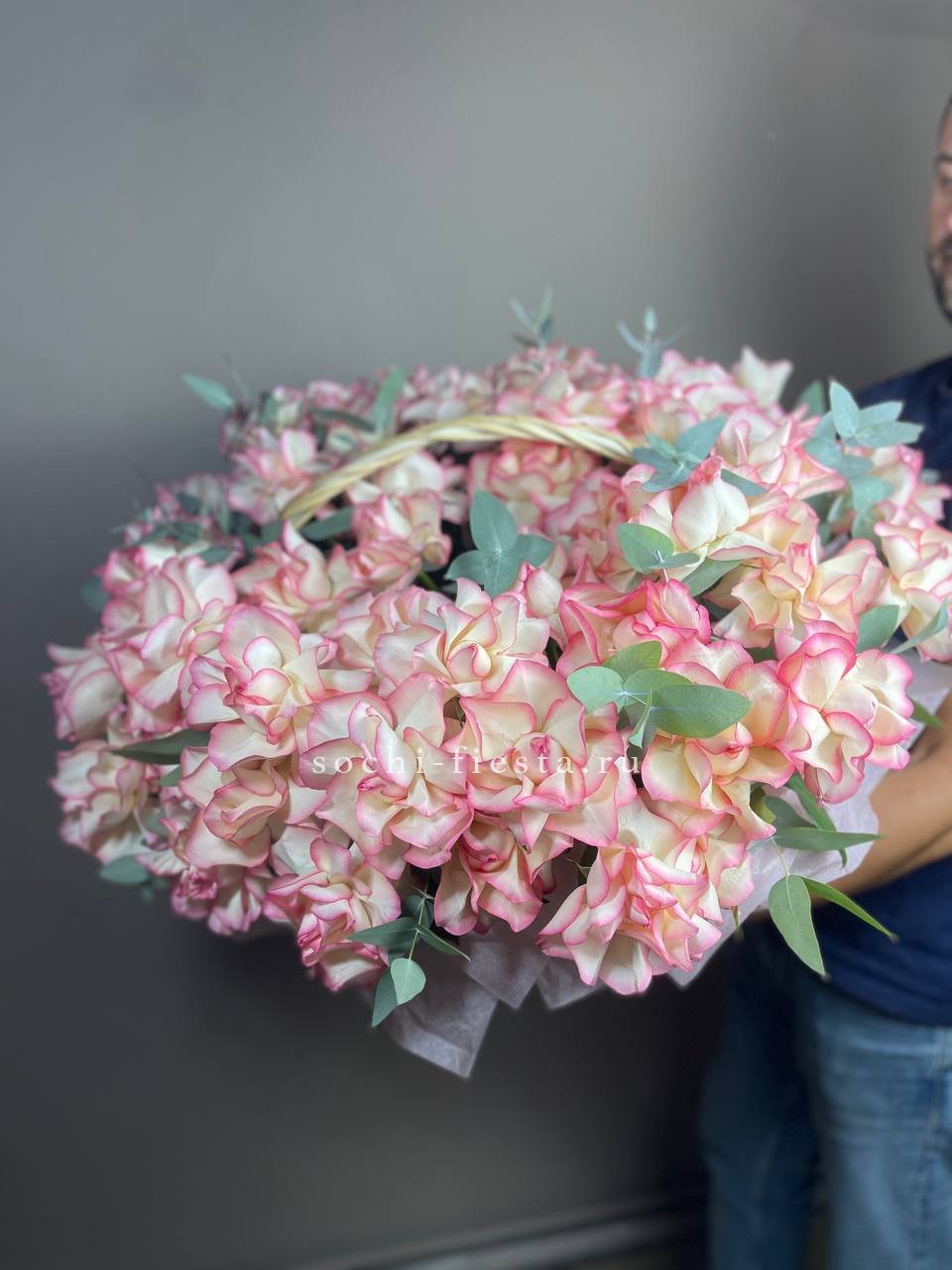 Пятьдесят один цветок в плетеной корзине дополнен серебристым эвкалиптом. Ветки зелени обрамляют каждый бутон и добавляют воздуха между головками роз. Устойчивая форма удобна для размещения на столе.