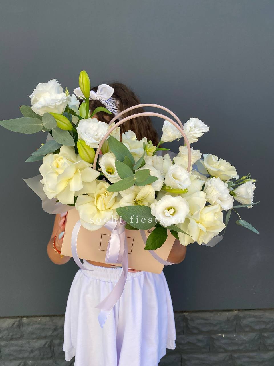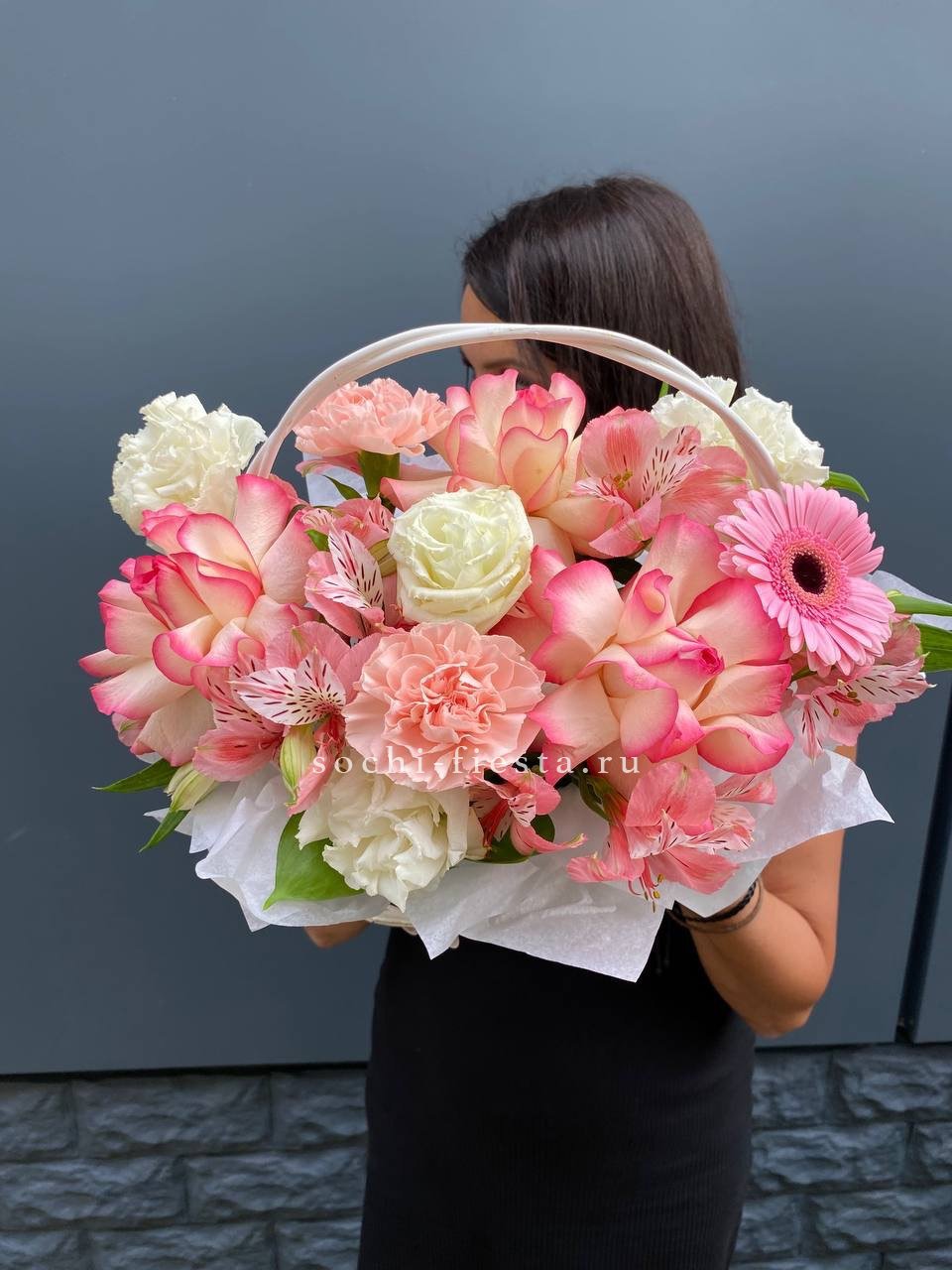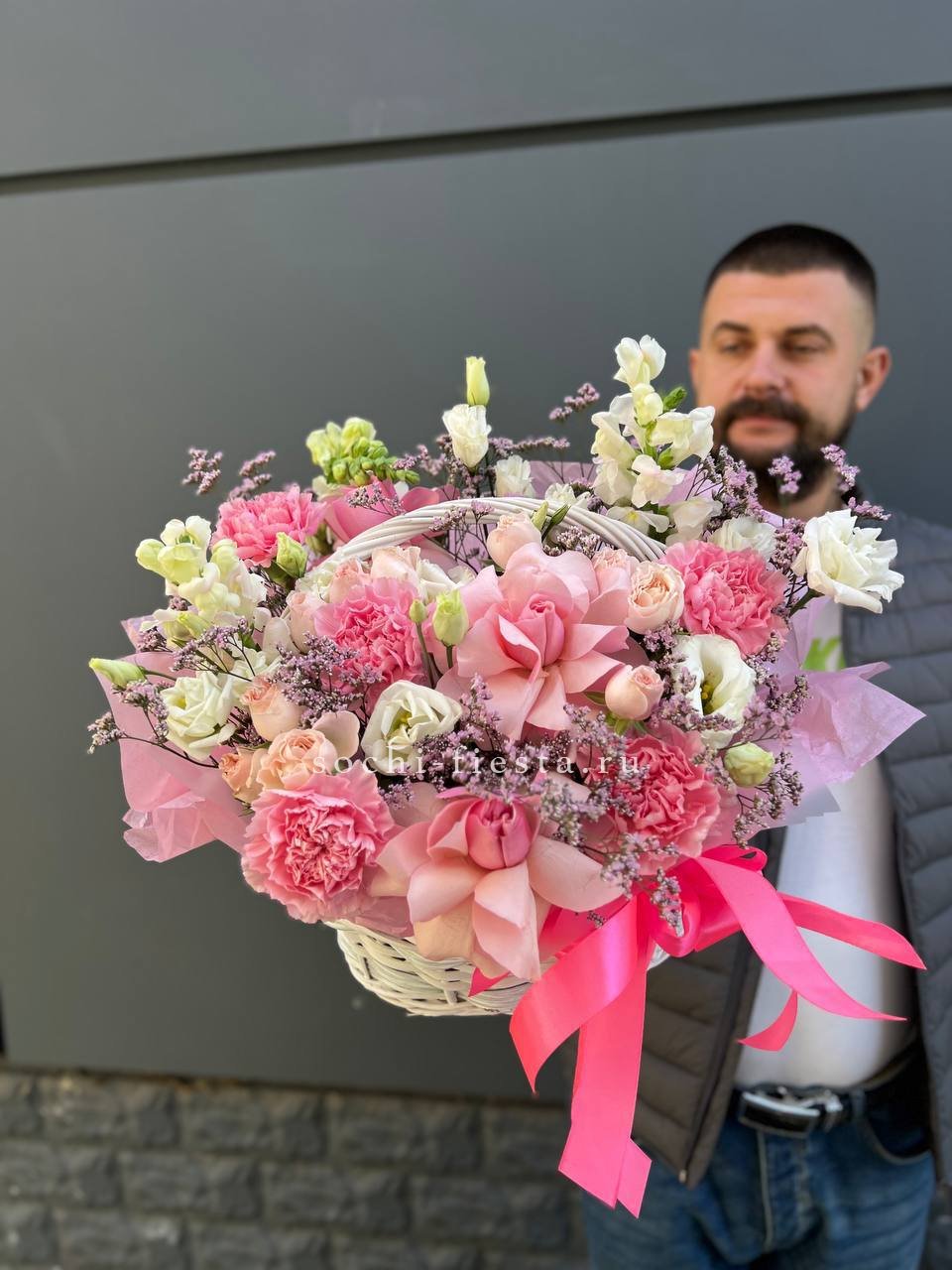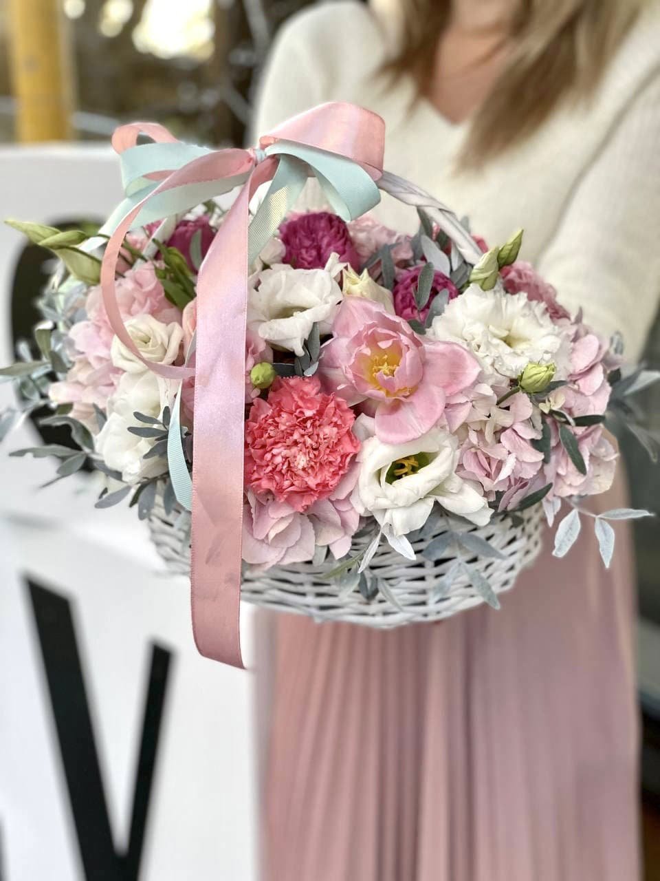 Пышная корзина с розовыми розами, гортензией и эустомой дополнена львиным зевом или маттиолой. Композиция создает ощущение летнего сада в одном объемном решении.