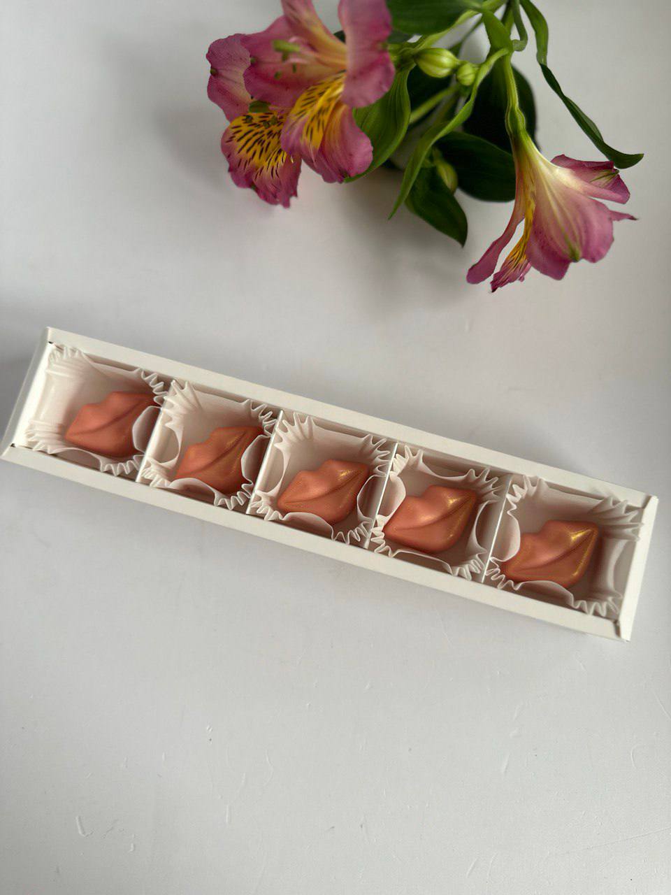 Пять шоколадных губ с неповторимым узором ручной росписи. Каждая деталь выполнена из бельгийского шоколада и подчинена общей идее игривого настроения. Яркий акцент для тех, кто любит эмоции.