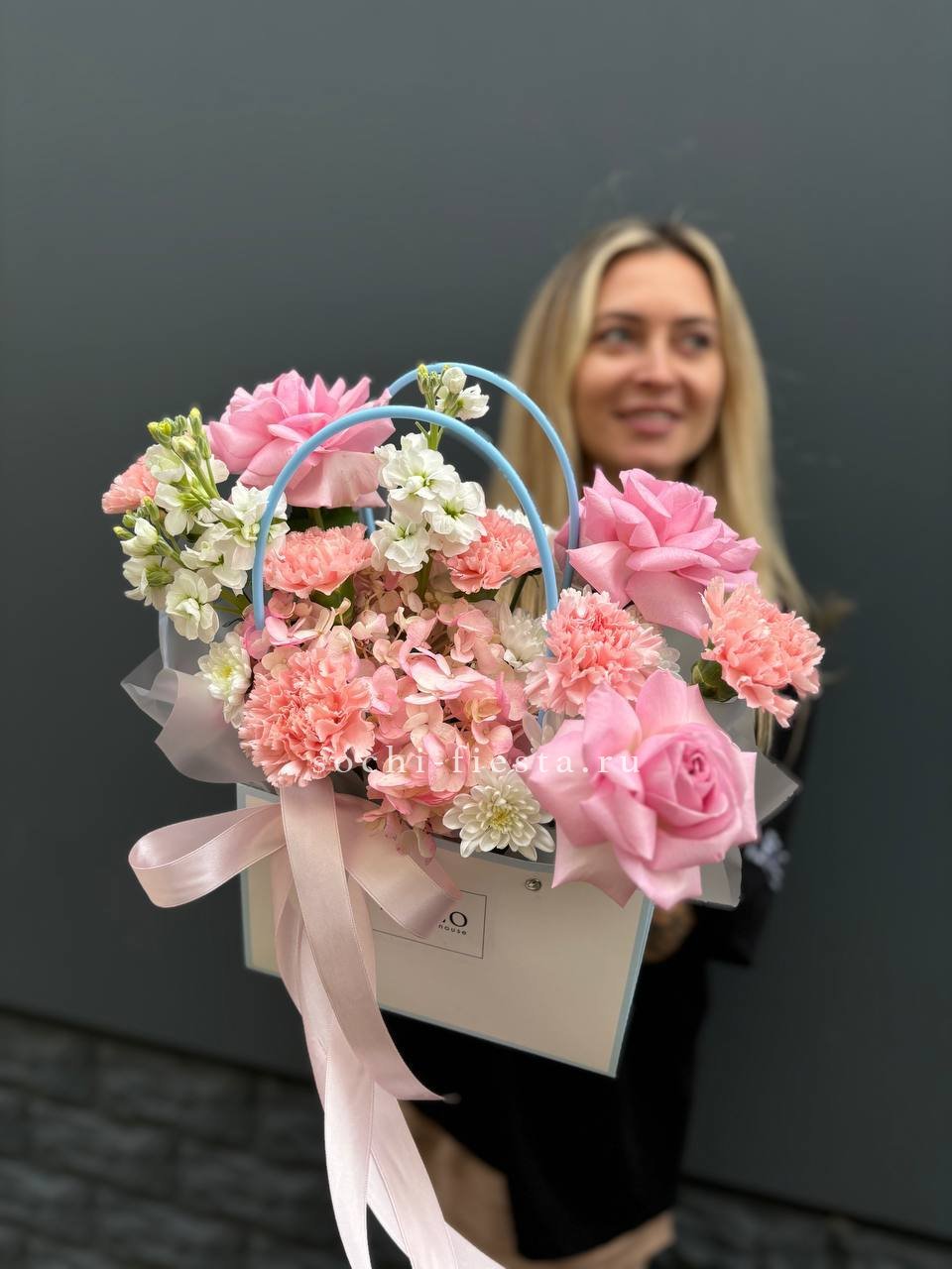 диантус, розовые розы, бомбастик, хризантемы, эустома, эвкалипт, бокс №20