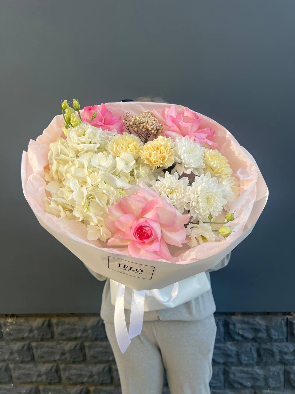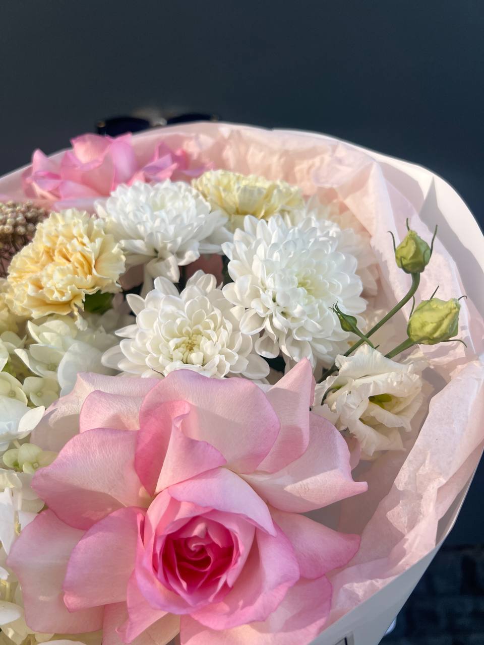 Девять кустов хризантемы в синих тонах собраны в плотную шапку. Каждый стебель несёт множество мелких соцветий, которые раскрываются постепенно. Такой букет сохраняет свежесть долго и радует насыщенным цветом.