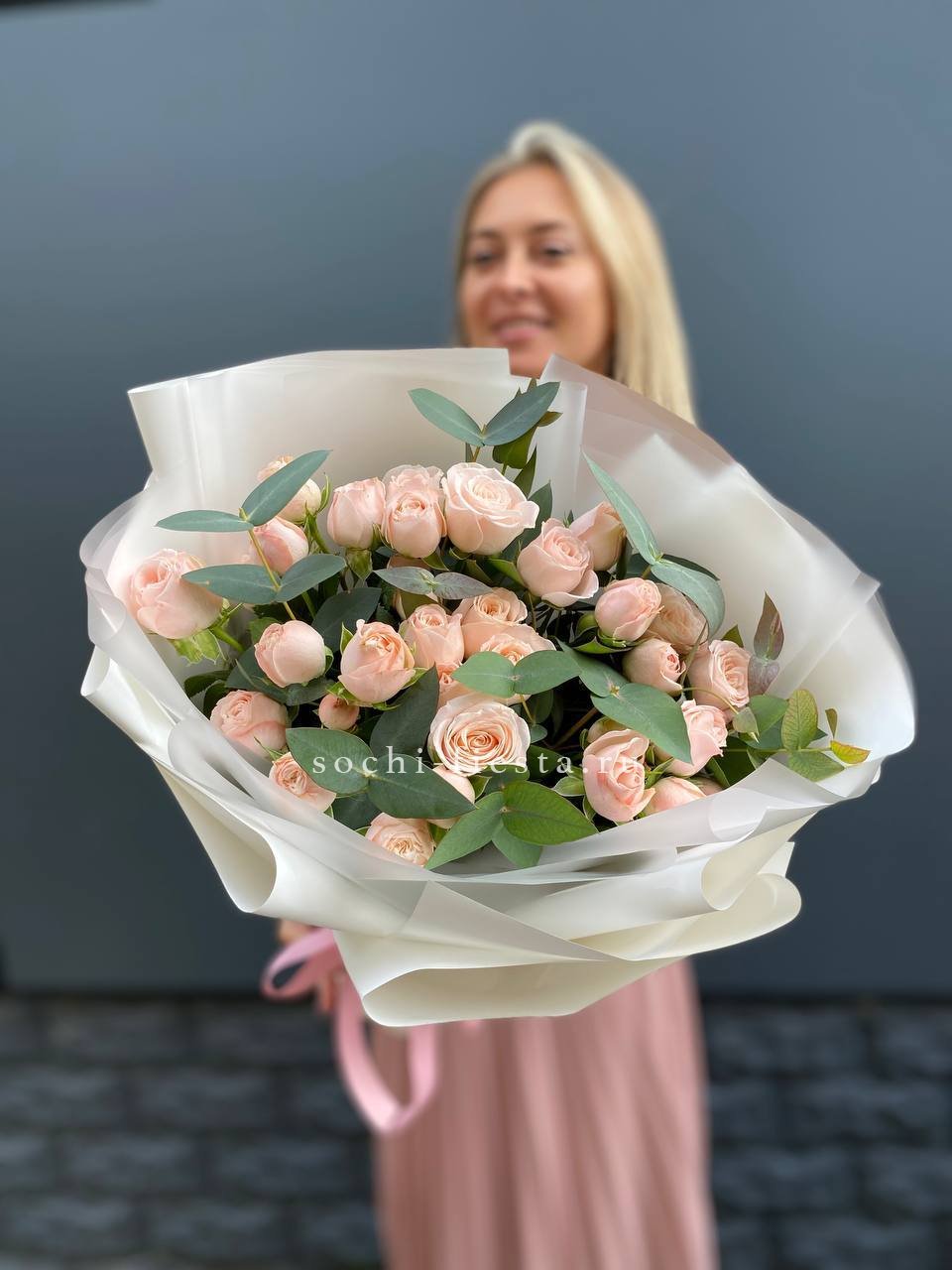 Этот букет — словно облако нежности и мечтательности. Бутончики кустовых роз, напоминающие тугие шарики, имеют светлый кремовый цвет с легким розовым оттенком. В сочетании с веточками свежего эвкалипта они создают атмосферу легкости и романтики. Это идеальный подарок для выражения самых светлых и теплых чувств, который растопит любое сердце.