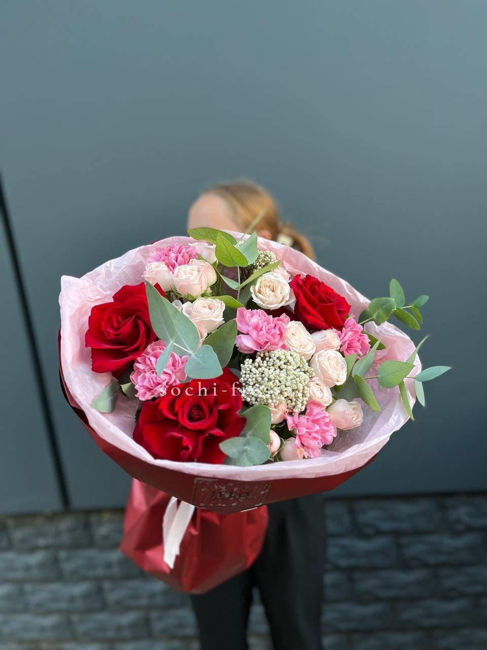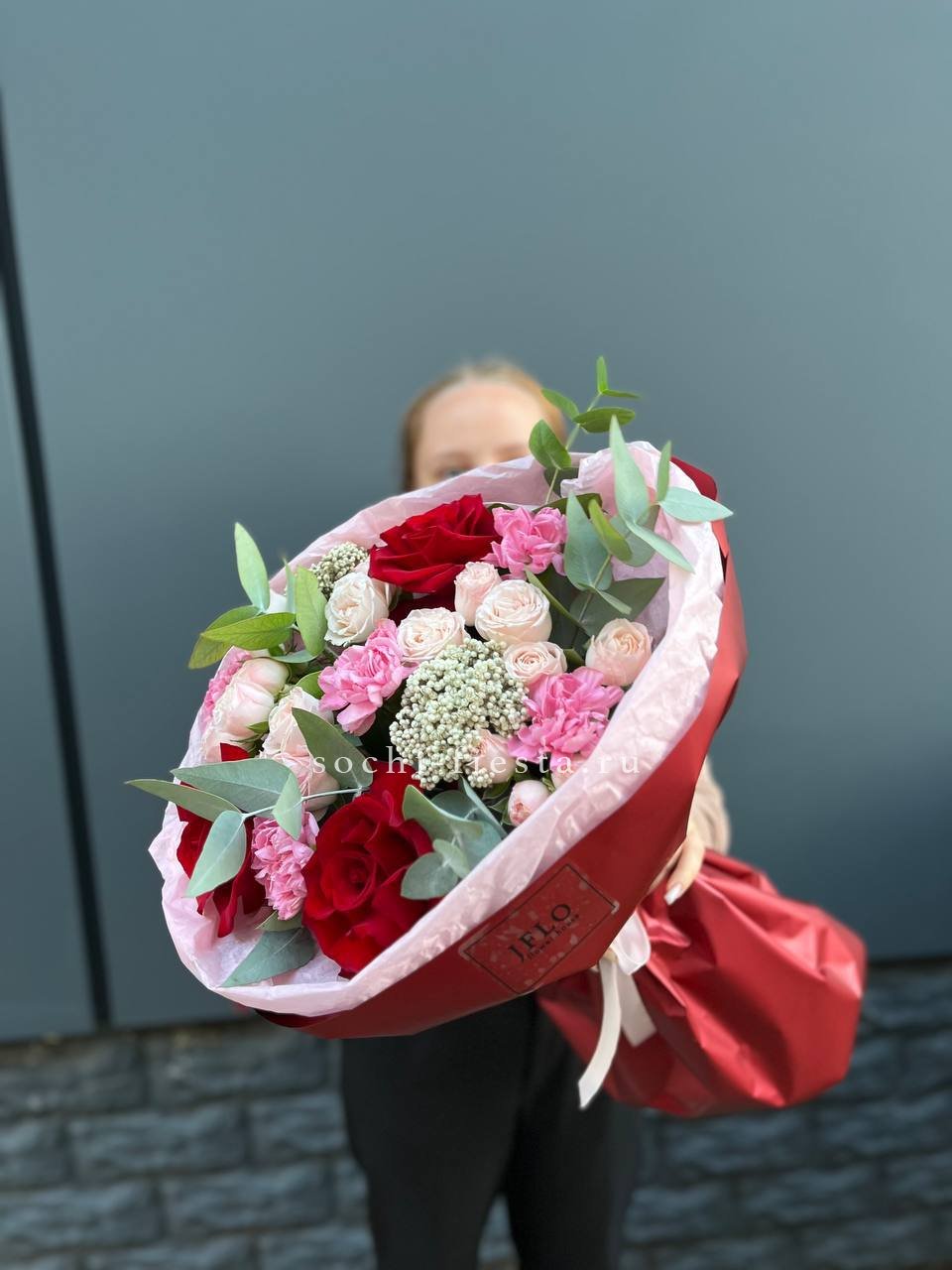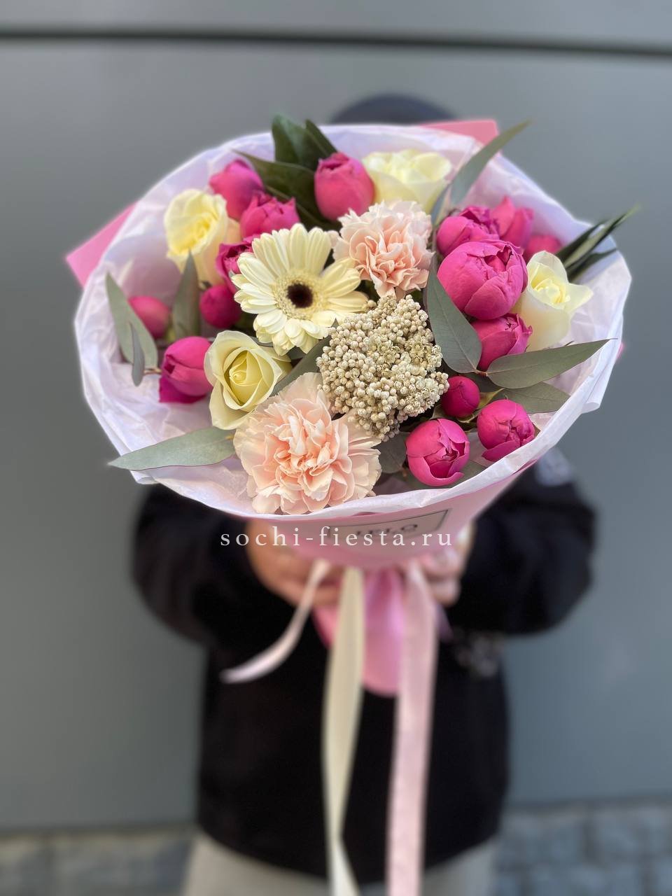 Пятьдесят один бутон под лентой — это объём и яркое присутствие в любом помещении. Герберы выстроены плотно, образуя впечатляющую композицию. Такой букет сложно не заметить.