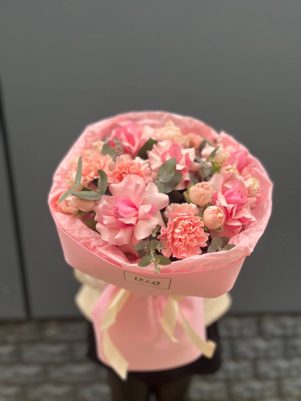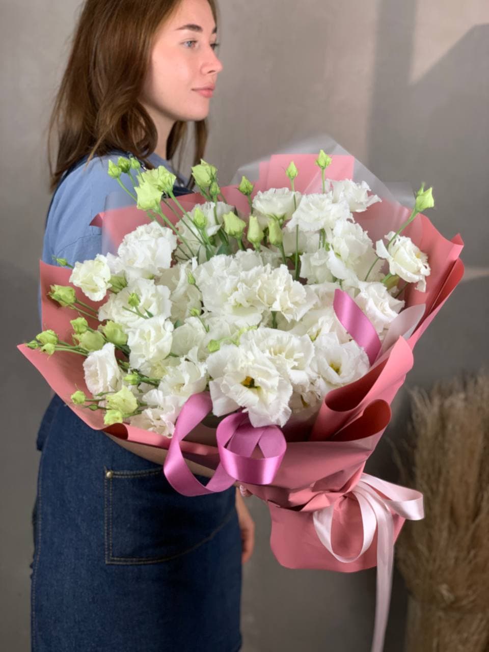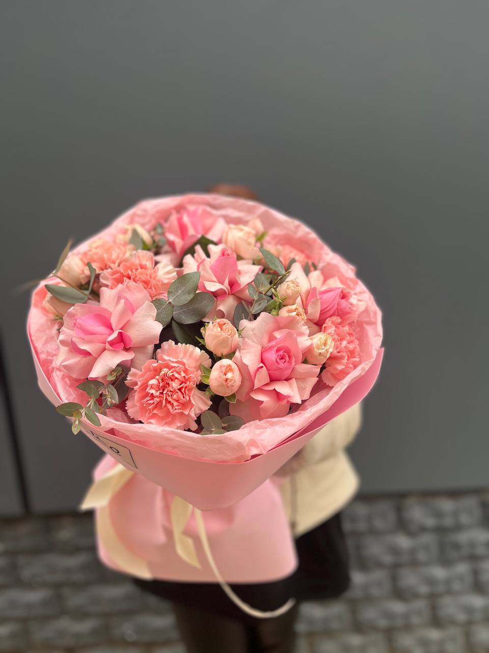Пятнадцать соцветий гортензии образуют густую сферу с насыщенной глубиной цвета. Объёмная композиция заполняет пространство и притягивает внимание своей плотностью.