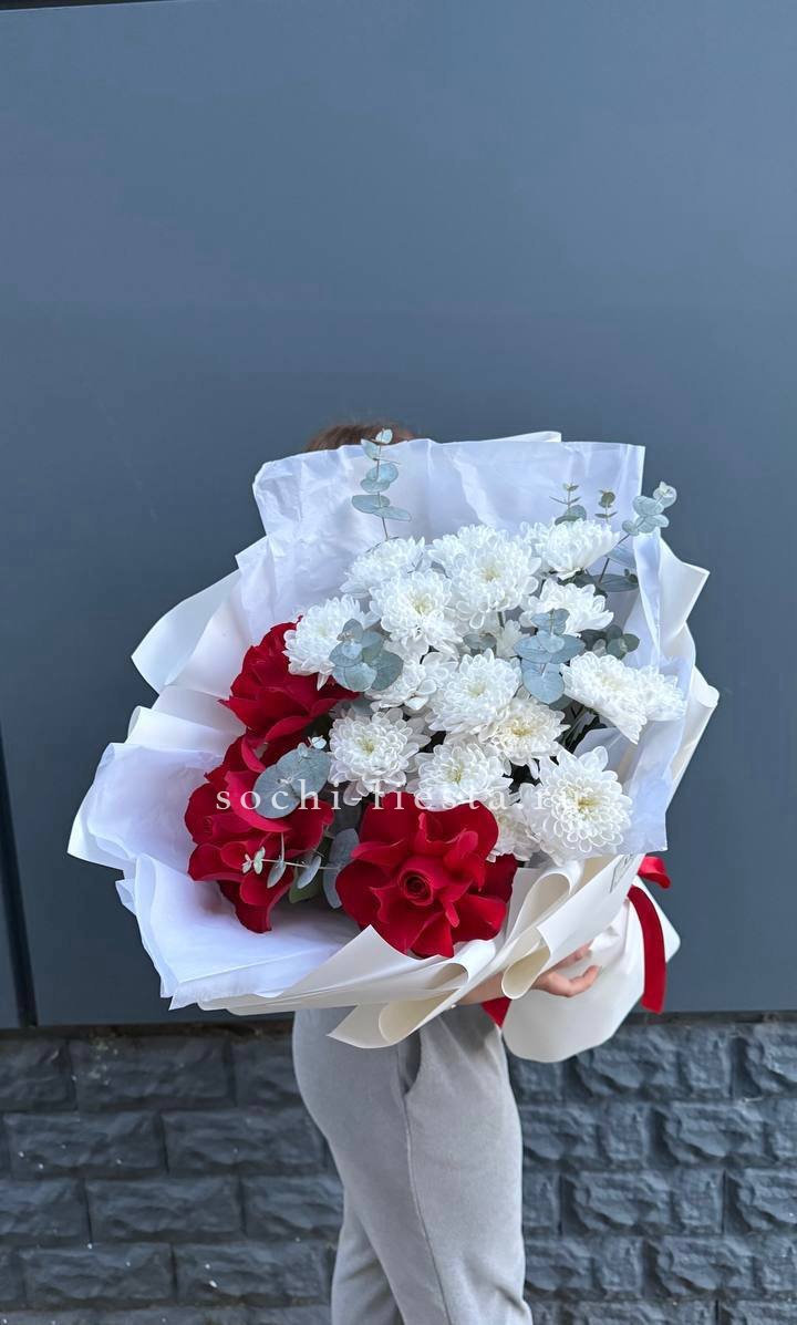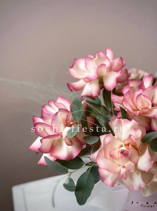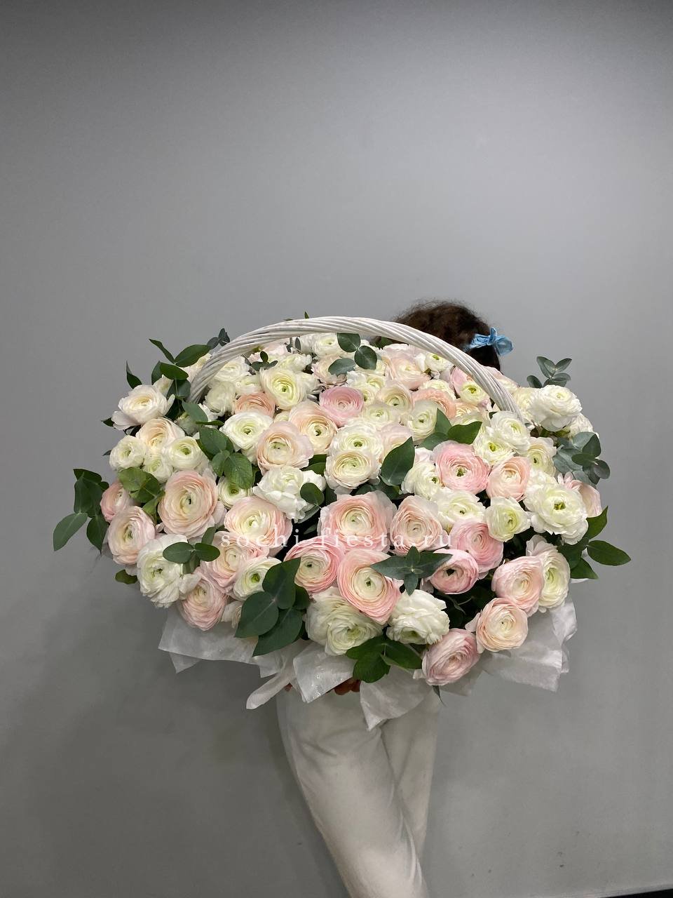 на фото 113 ранункулюсов микс с эвкалиптом в корзине