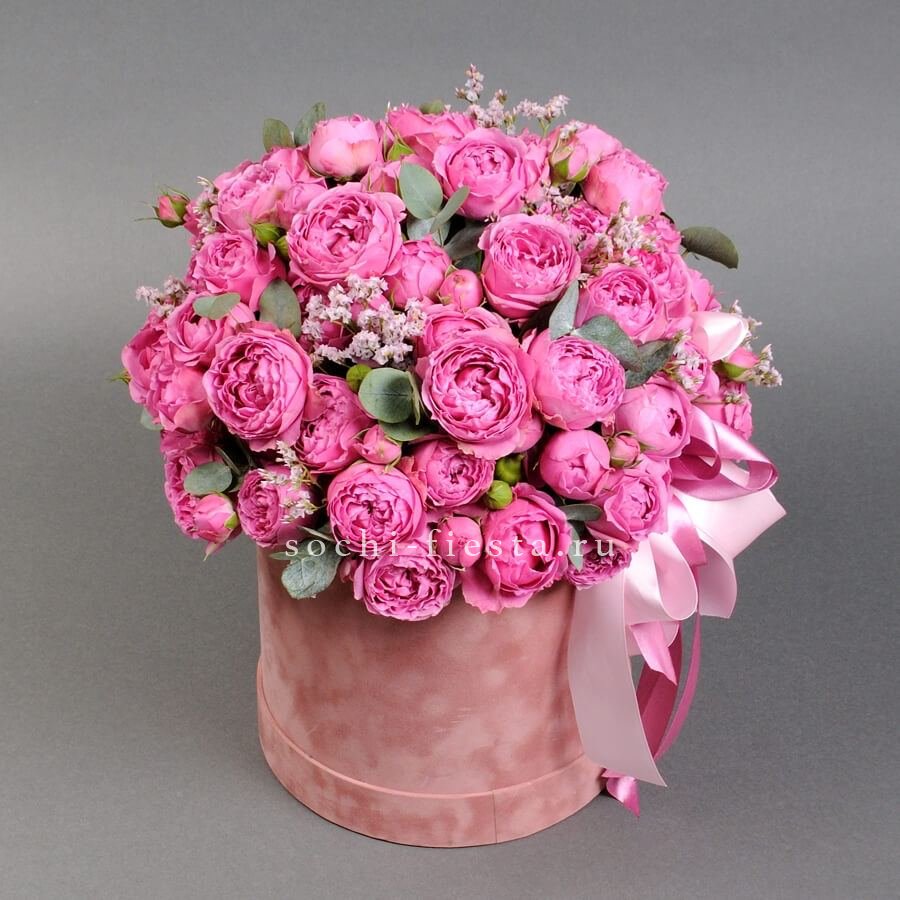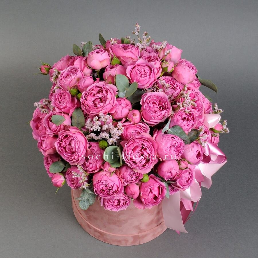 Плотная сборка ранункулюсов в корзине с веточками эвкалипта образует богатую композицию. Множество бутонов с волнистыми лепестками создают пышную фактуру и завораживают глубиной цветовых переливов.