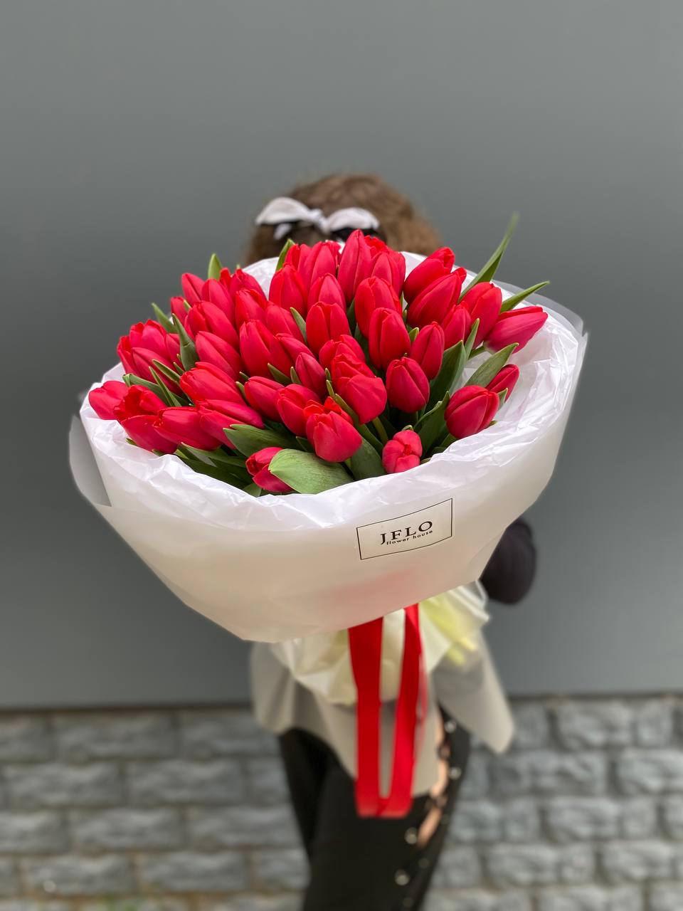 Сто один белоснежный бутон собран в монохромную композицию впечатляющего объема. Плотная сборка создает графичный силуэт, который заполняет пространство светом и весенней свежестью.
