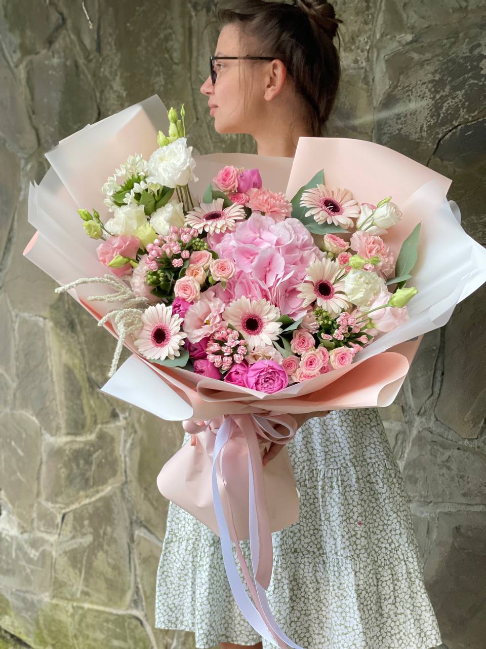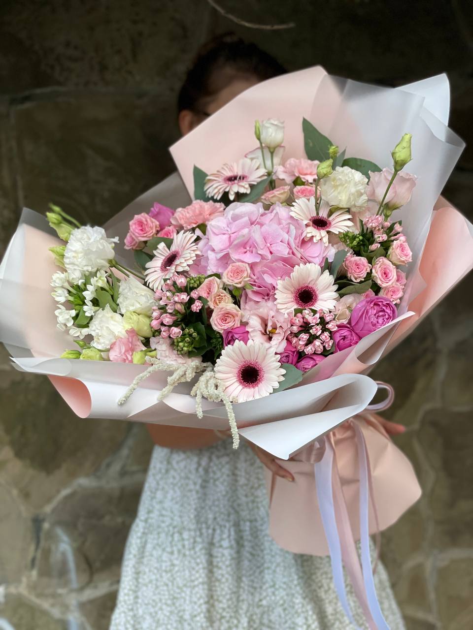 композиция из гортензий, протеи, хамелациума, роз, эвкалипта, бомбастика, диантусов в авторском оформлении.