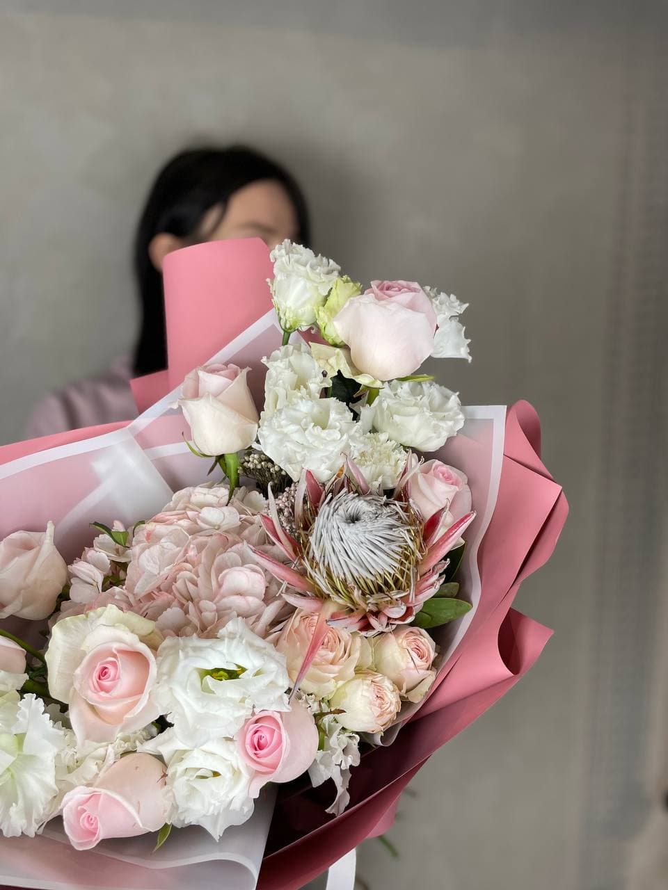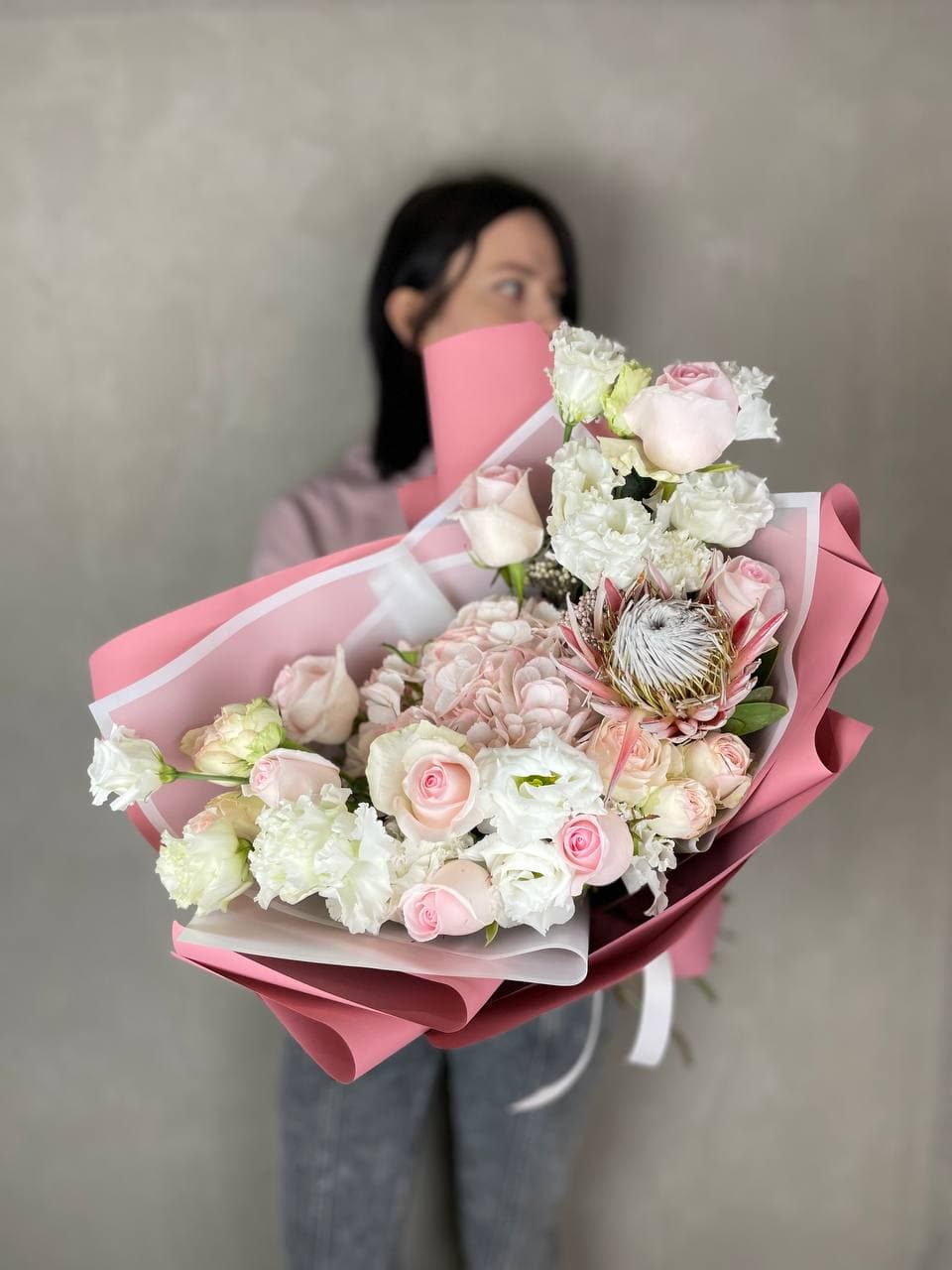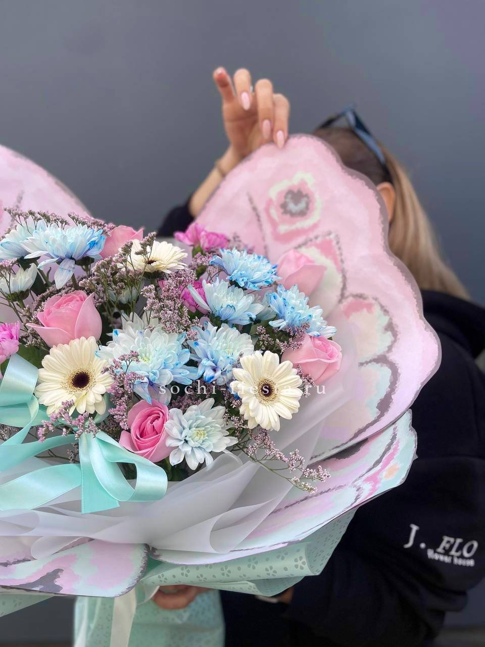 Голубые хризантемы встречаются с розовыми розами и герберами в свободной композиции. Лимониум добавляет воздушности, а декоративная бабочка завершает образ.