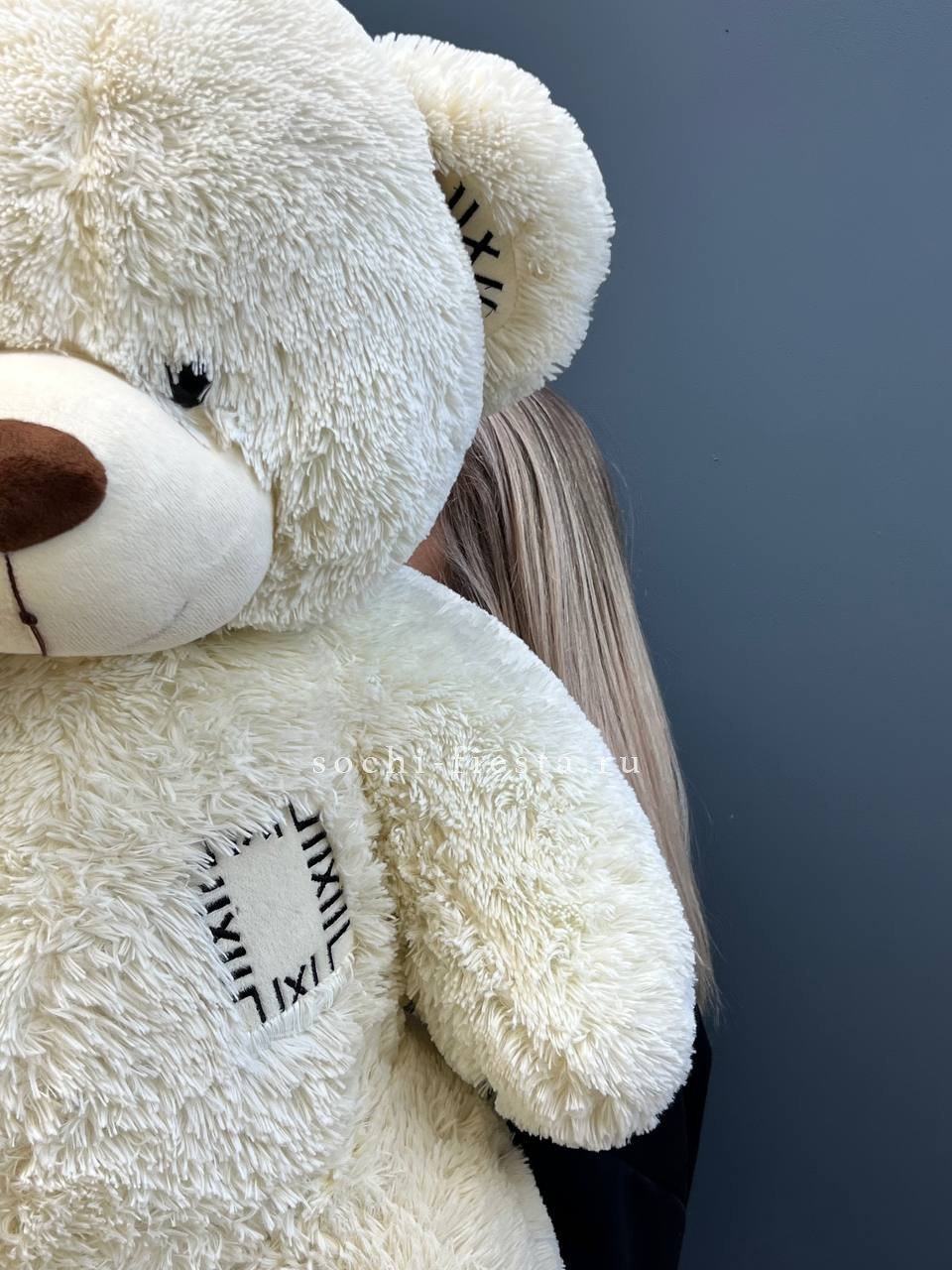 Мягкий плюшевый мишка метровой высоты с густым ворсом и добродушной мордочкой. Объемная фигура с крепкими лапами и округлыми формами создает ощущение уюта и надежности в любом пространстве.