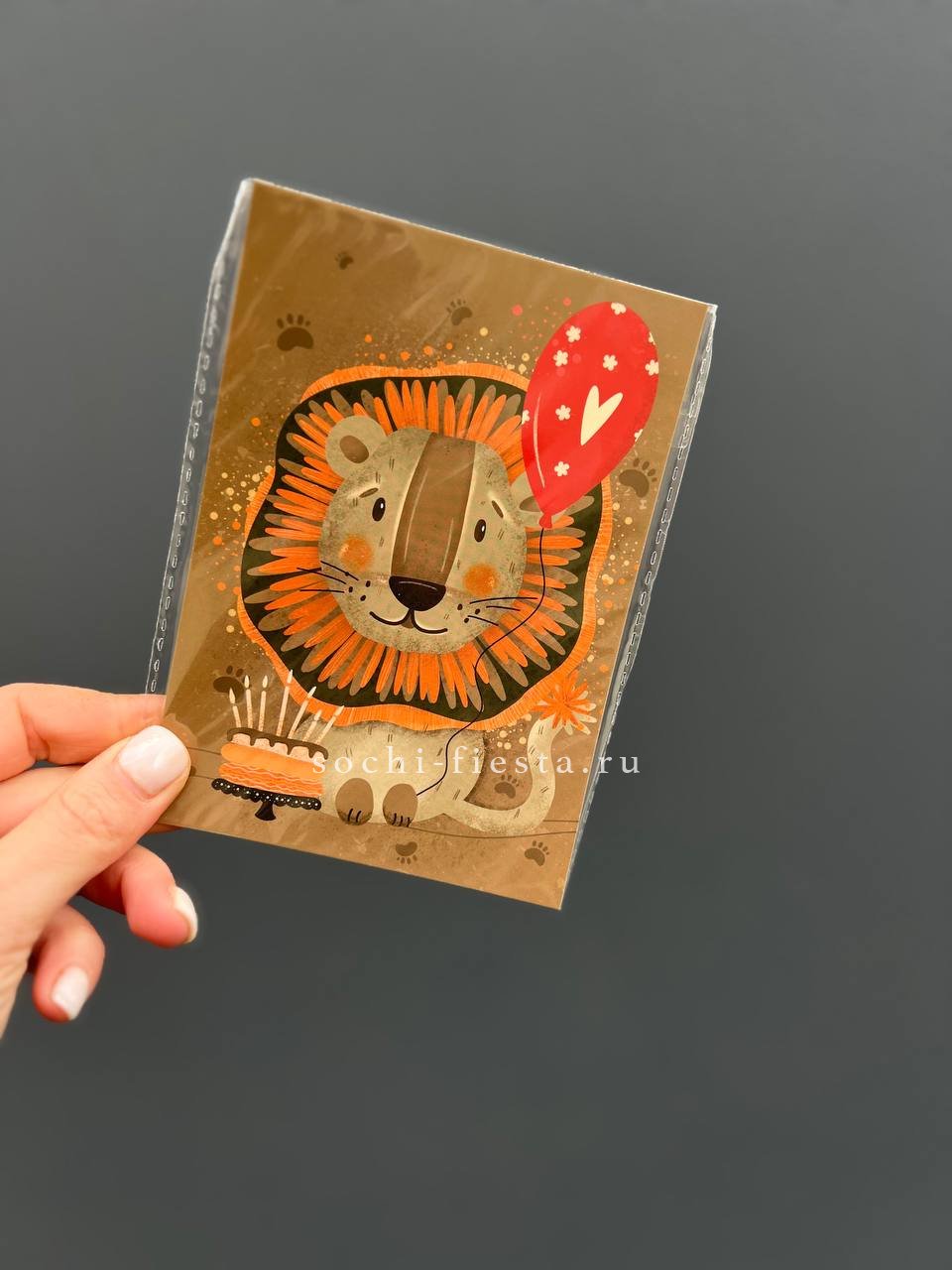 Открытка к букету "Лев с тортом”
