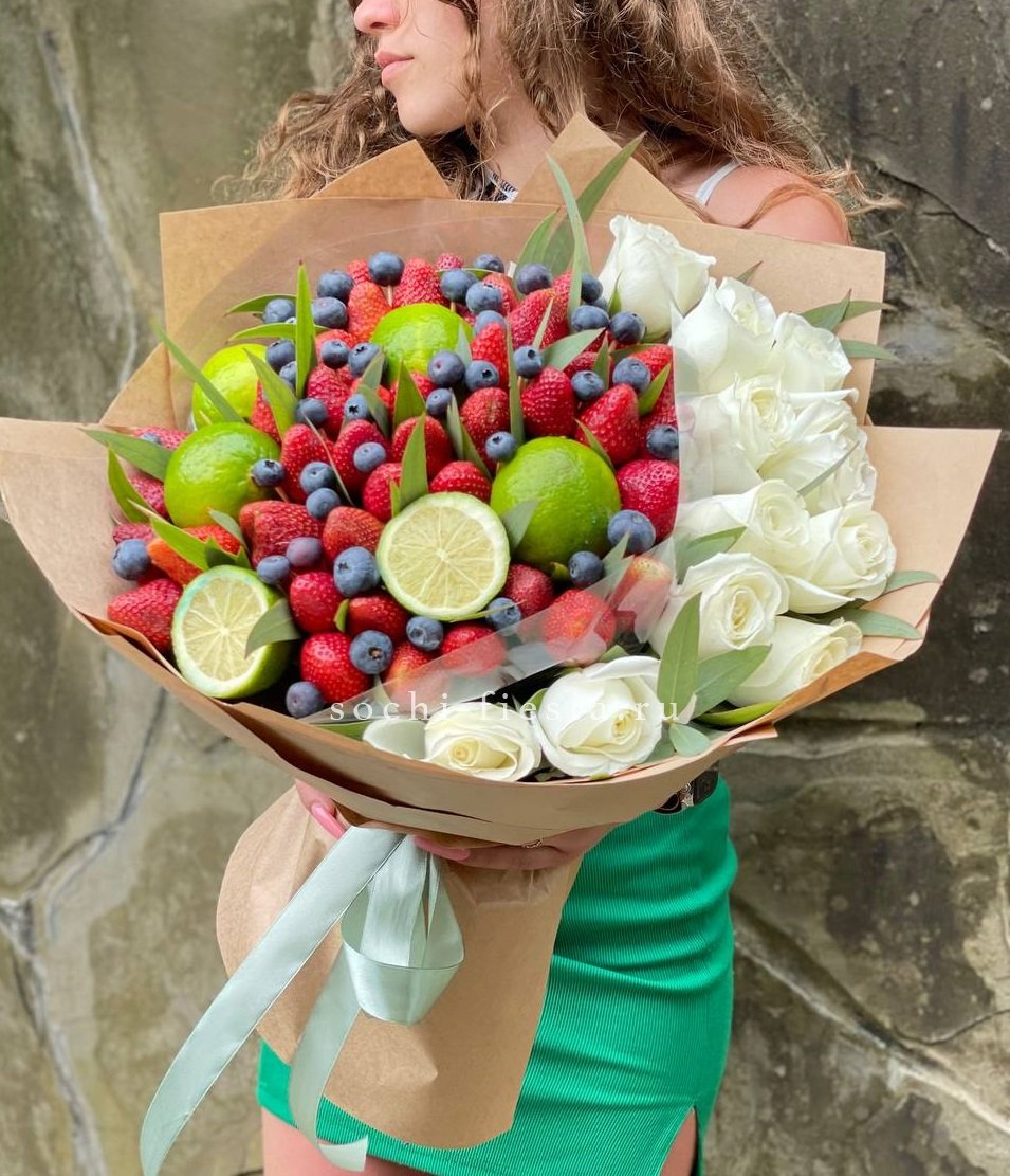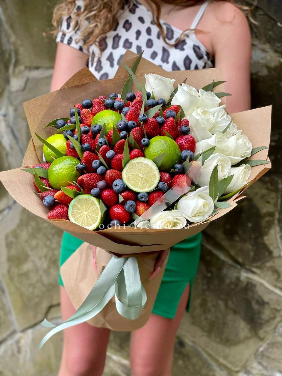 Сочная клубника соседствует с яркими дольками лайма, а розы добавляют композиции живой объём. Голубика завершает гамму насыщенными тёмными акцентами. Букет для тех, кто любит свежие идеи и неожиданные сочетания.
