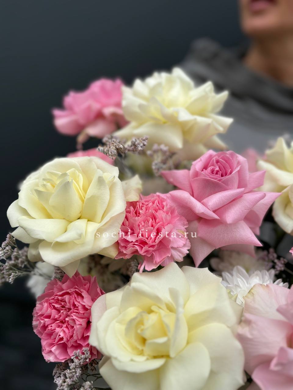Для заказа товара "Коробка французских роз и диантусов "Бони"" с доставкой в Долгопрудном нажмите