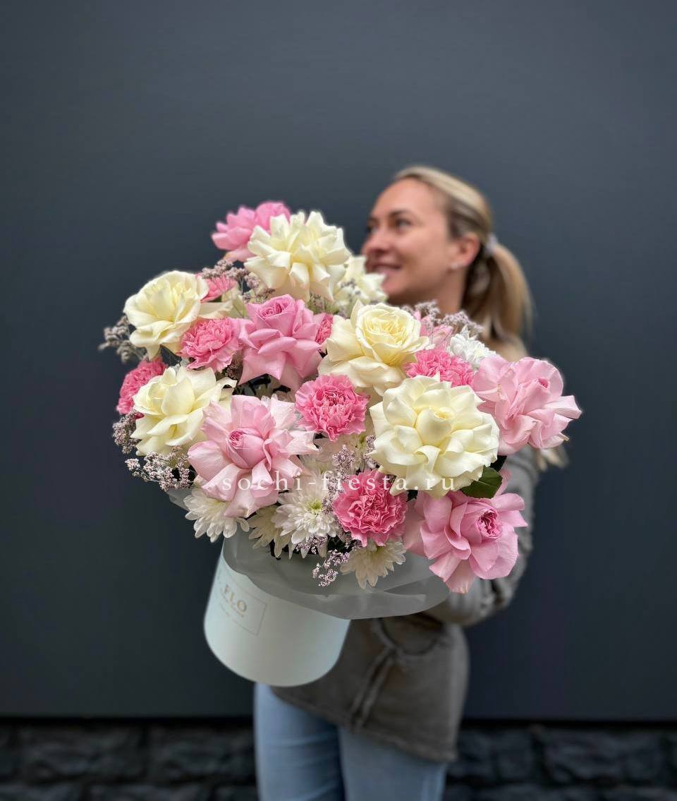 Вывернутые розы и яркие герберы собраны в плотную композицию с диантусами и кустовой хризантемой. Коробка удобно размещается на столе и держит форму несколько дней. Свежее решение для поздравления без лишних деталей.