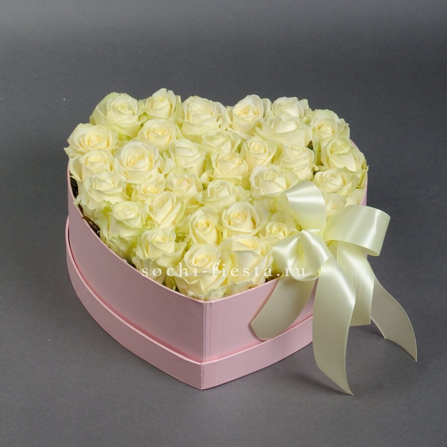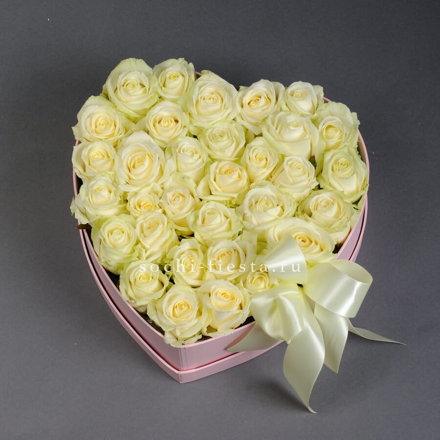 35 белых роз в коробке "Сердце"