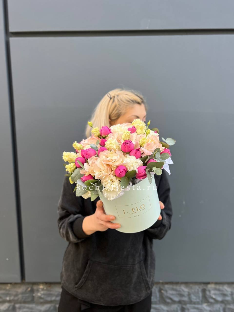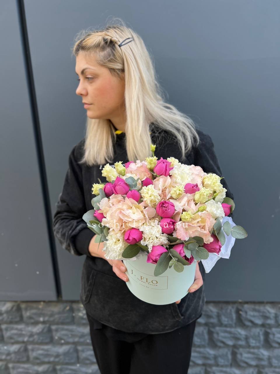 гортензия, вывернутые розы, диантус, кустовая роза, эустома, бокс D20, тишью.