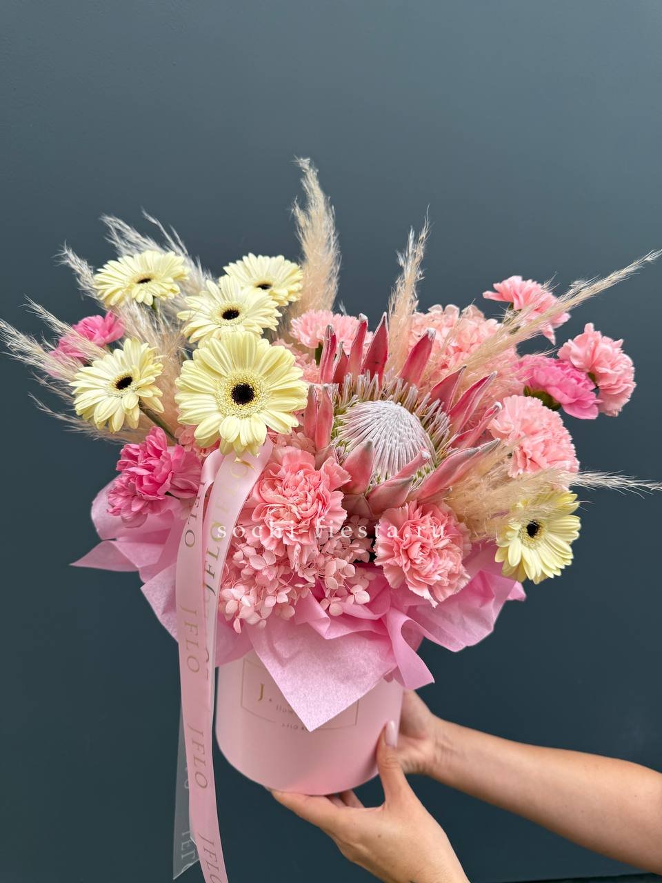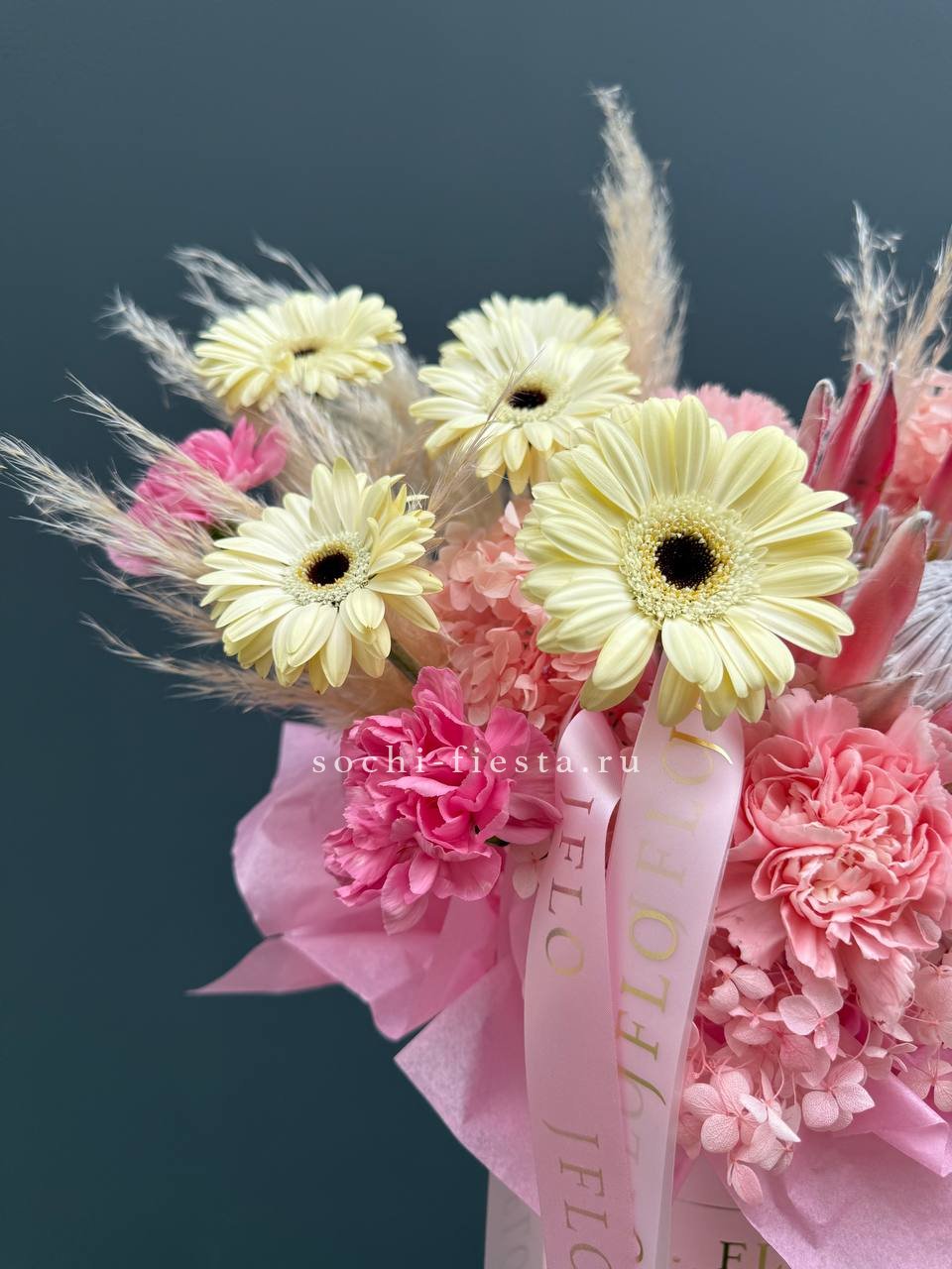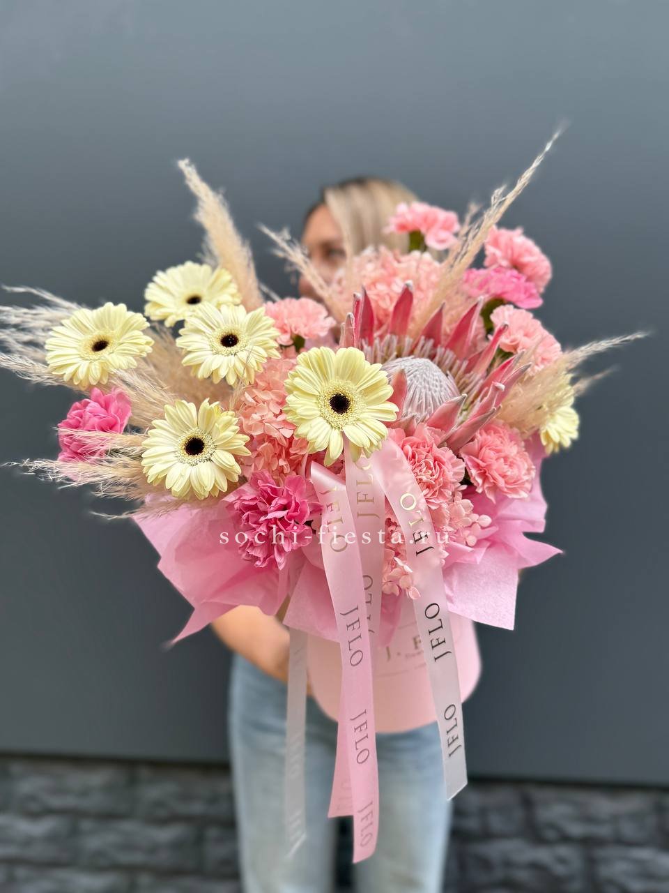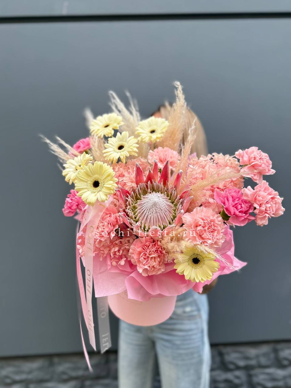 Экзотическая протея задает тон композиции с гортензией и яркими гербера. Диантусы и декоративные злаки придают бирюзовому боксу динамику и легкую небрежность.