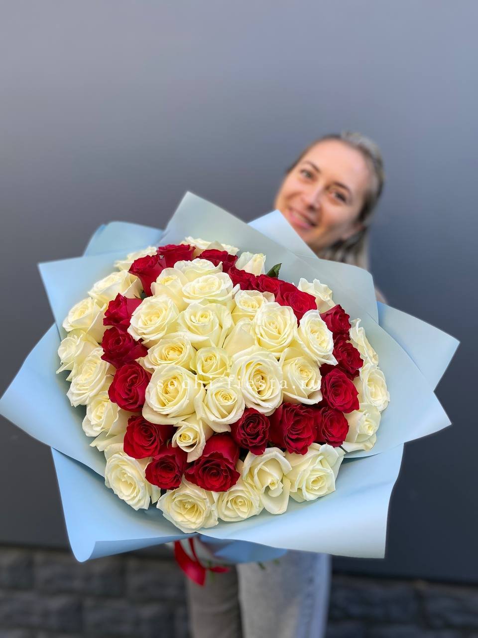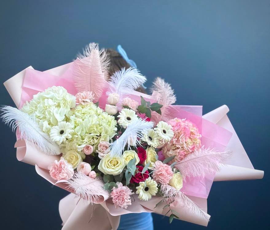 Розовые розы и мисти баблс выстраивают вертикальный силуэт с лёгким движением вверх. Гортензия у основания добавляет устойчивость и завершает линию композиции.