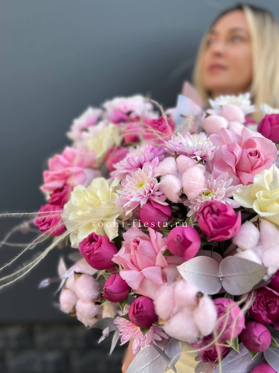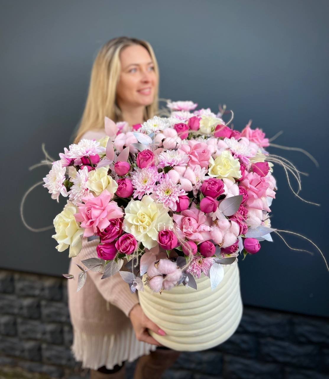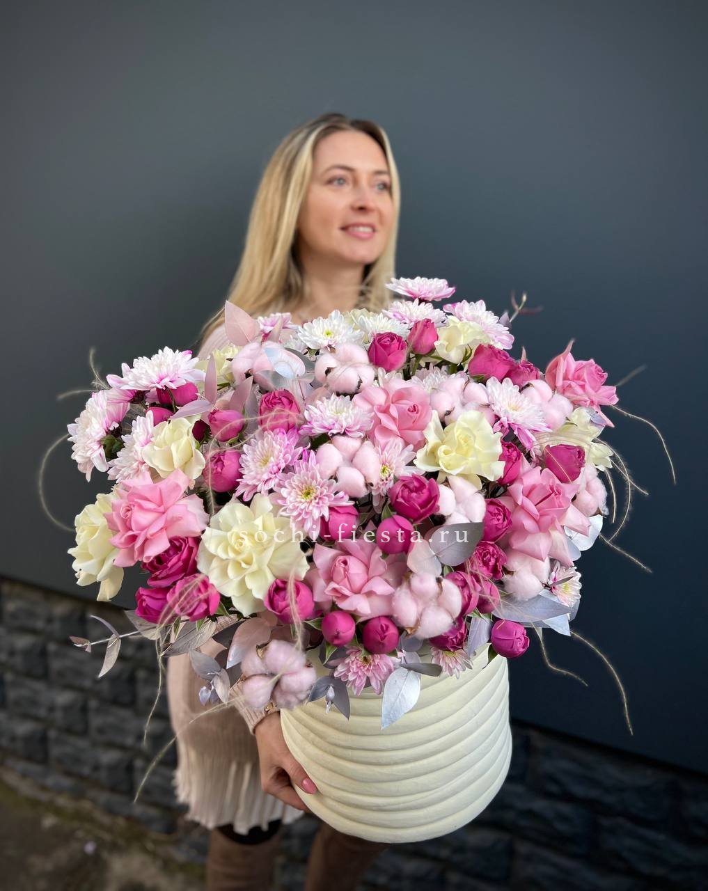 Широкий бокс объединяет пионовидные розы с пушистыми головками хлопка и воздушными метелками ковыля. Композиция построена на слоях: плотные бутоны у основания переходят в легкие текстуры по краям. Форма держится естественно и наполняет пространство.