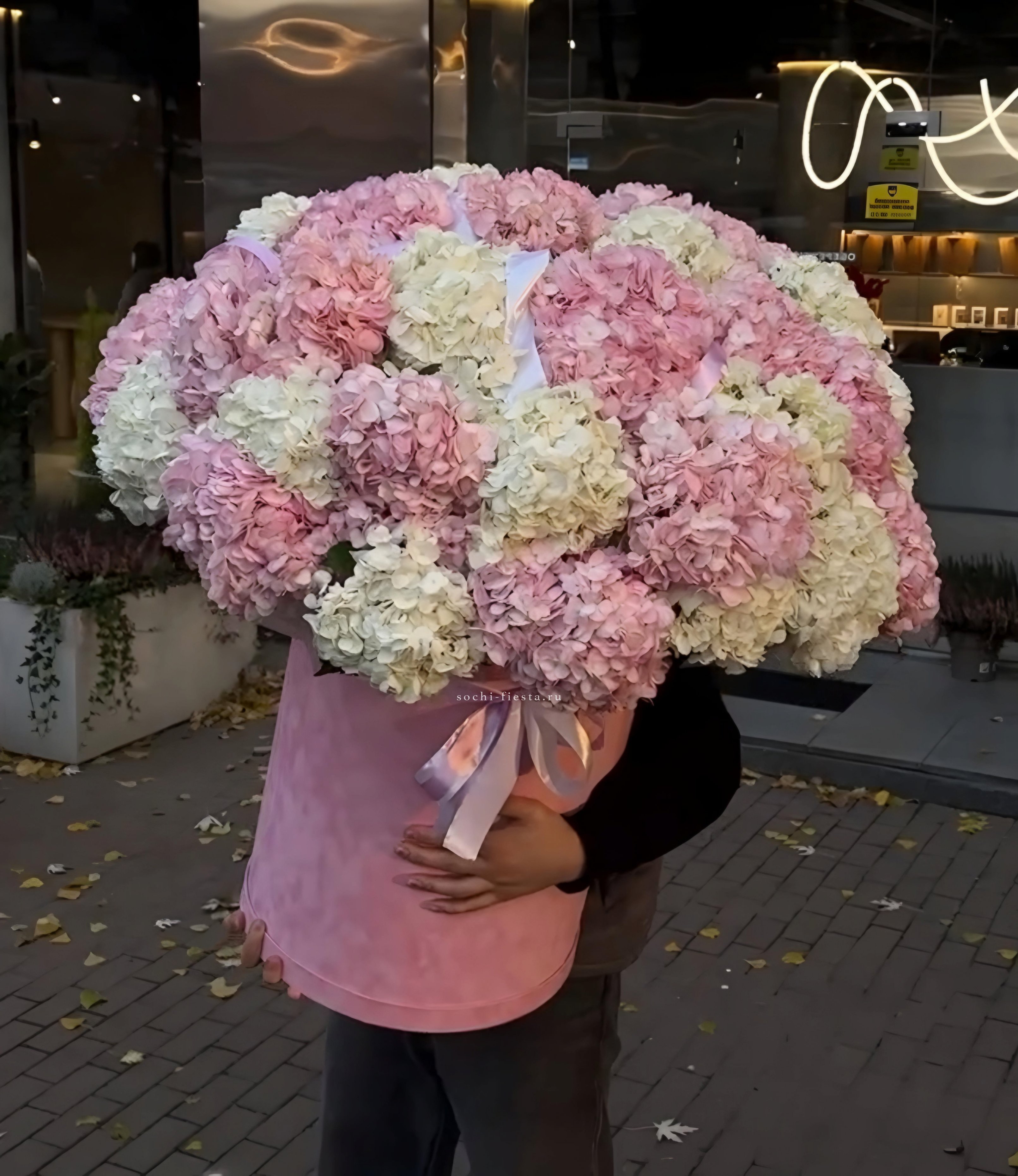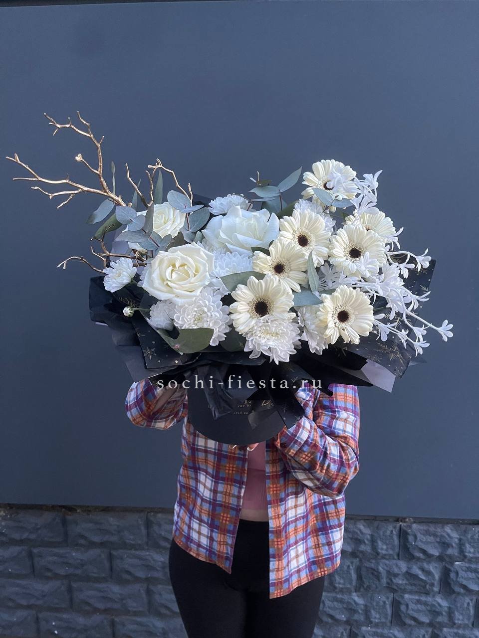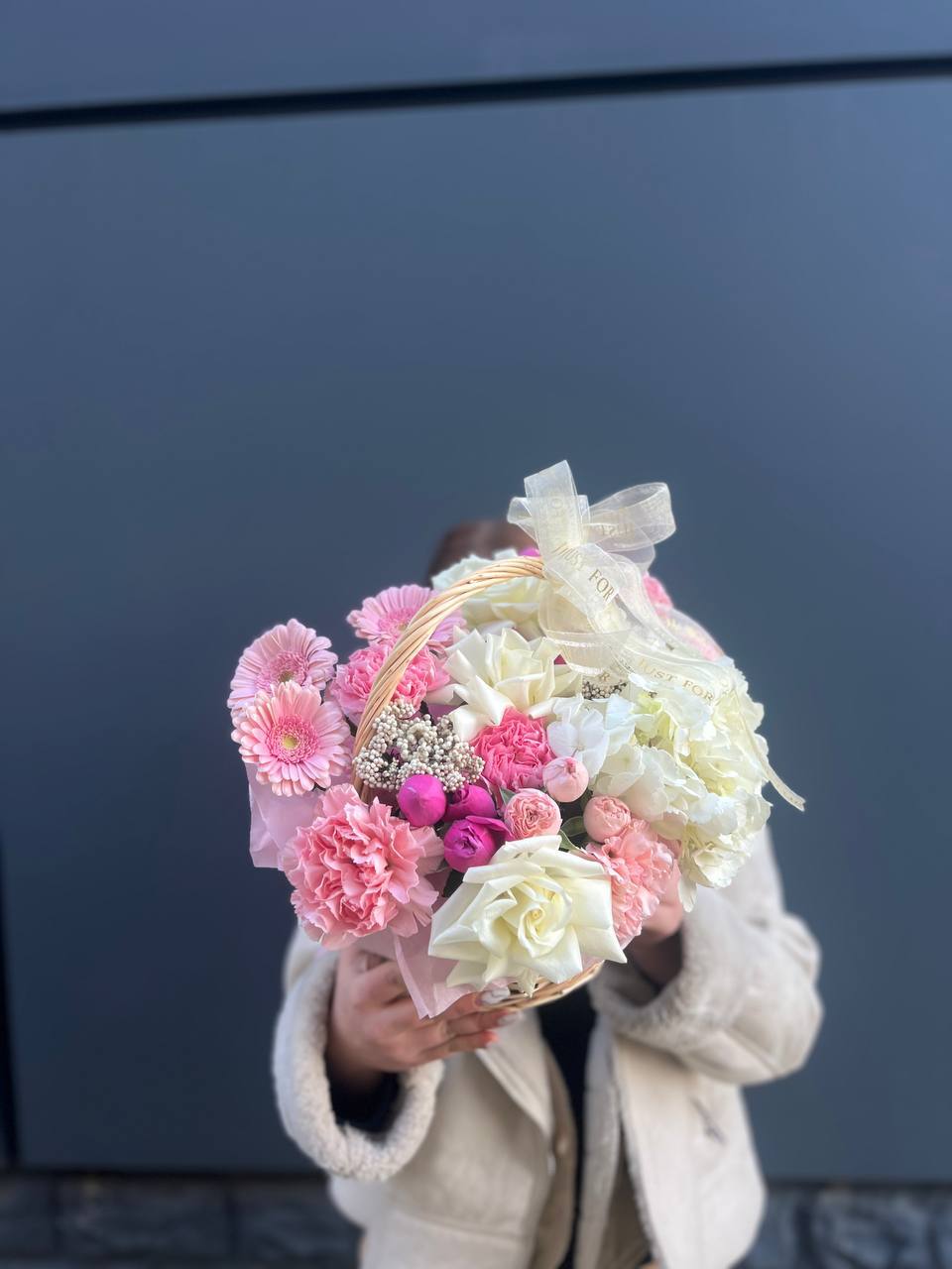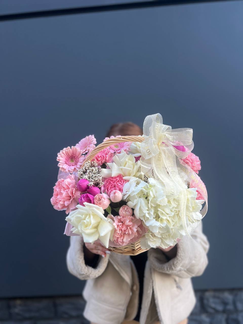 Широкий бокс объединяет пионовидные розы с пушистыми головками хлопка и воздушными метелками ковыля. Композиция построена на слоях: плотные бутоны у основания переходят в легкие текстуры по краям. Форма держится естественно и наполняет пространство.
