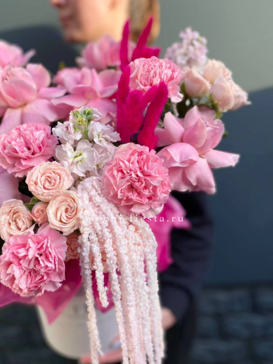 розы, протея, диантус, гербера, эустома, лилия, бокс 20.