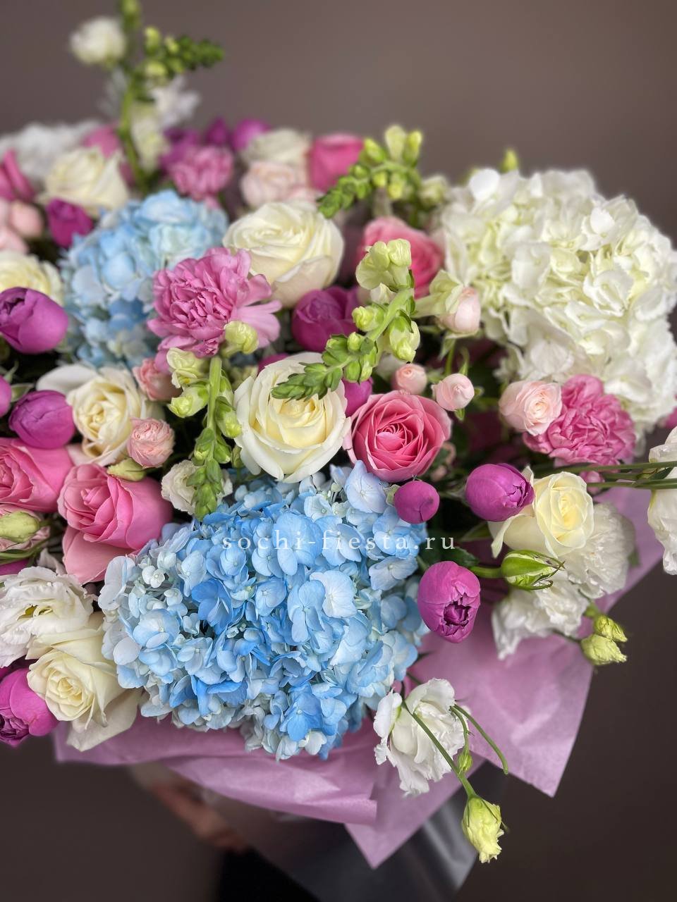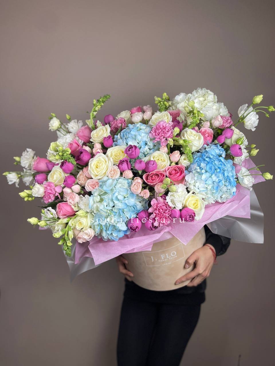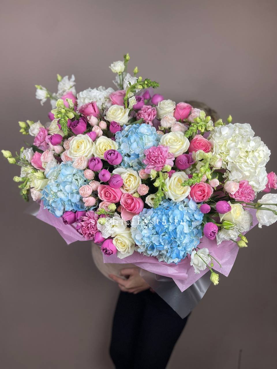 Масштабная композиция объединяет диантусы, антиринумы и розы разных сортов в единую структуру. Крупный бокс позволяет раскрыть каждый цветок в полную силу. Присутствие такой работы ощущается сразу.