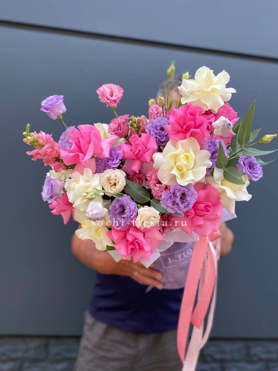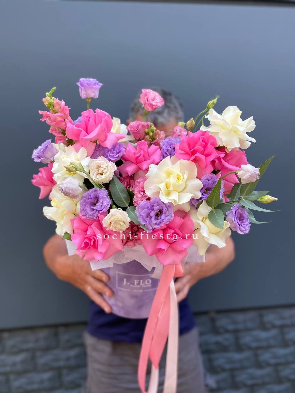 Mattina собрана из эустомы, французских роз и лилии с добавлением эвкалипта. Композиция держит форму и создаёт ощущение утренней свежести в компактном формате.