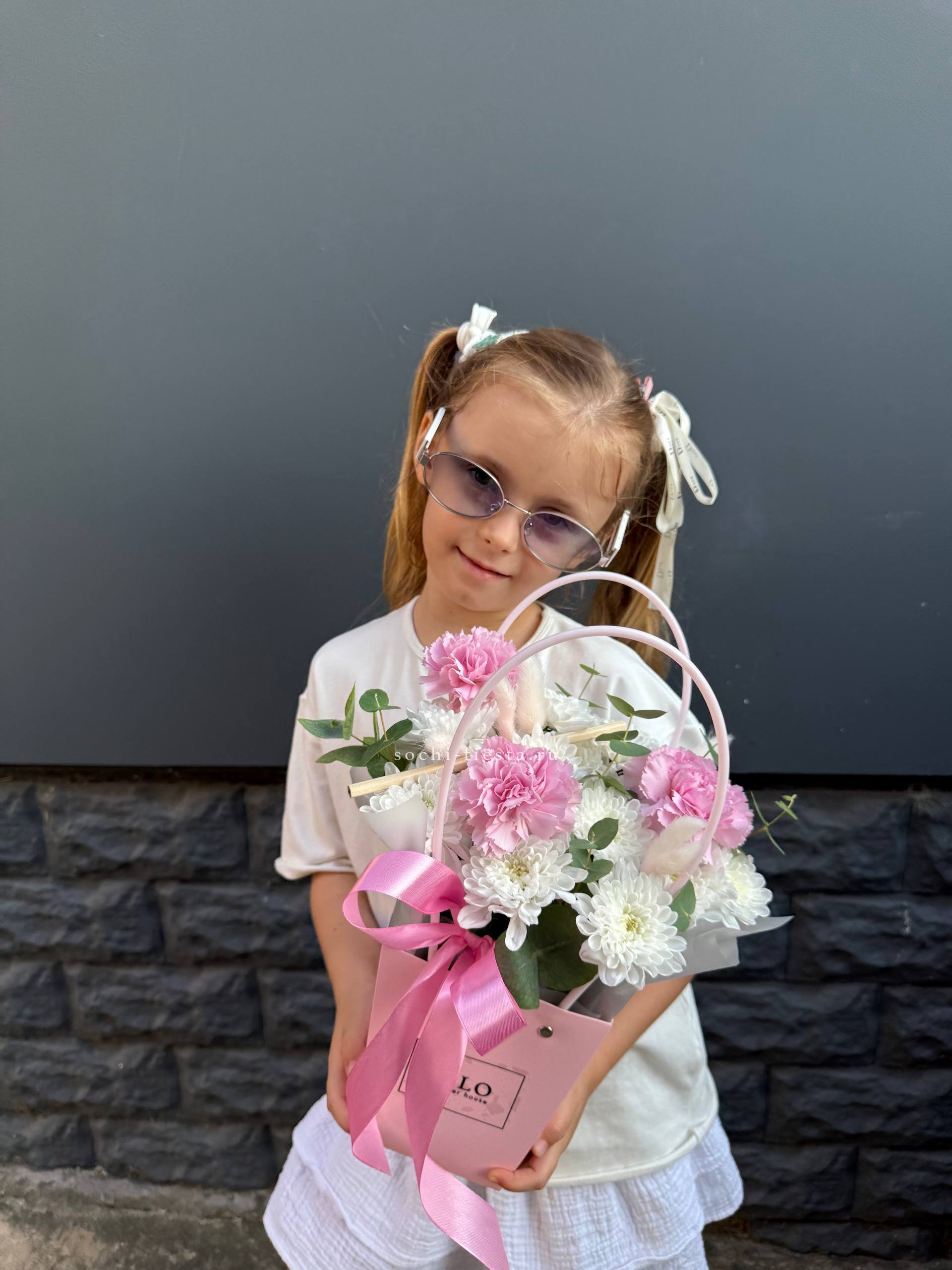Хризантемы и диантус в удобной сумочке держат форму долго и выглядят свежо несколько дней. Лагурус добавляет текстуры, а эвкалипт дополняет композицию природной естественностью.