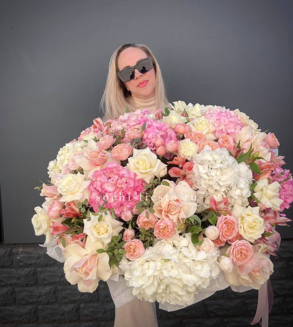 Пышная корзина с бархатными гортензиями и розами разных форм создает живописную композицию в романтичной гамме. Альстромерии и диантусы добавляют воздушности между крупными соцветиями. Эвкалипт завершает образ свежими нотками зелени.
