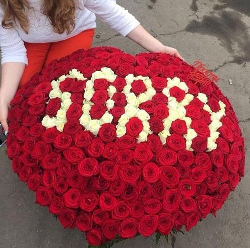 Триста пятьдесят одна роза выстраивается в живое послание из алых и белоснежных бутонов. Каждый цветок здесь часть признания, которое невозможно произнести вслух. Масштабная композиция для момента, когда важна искренность.