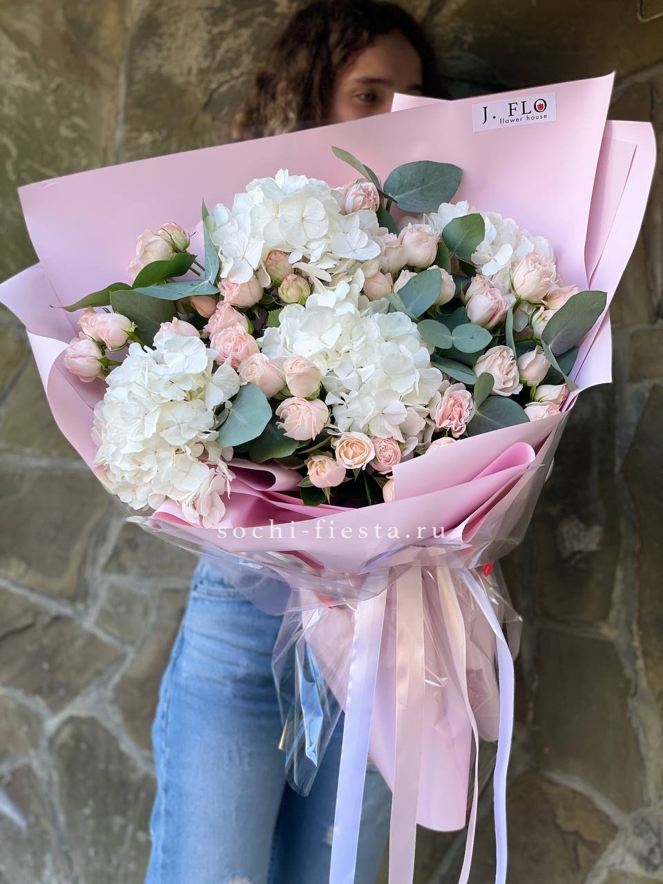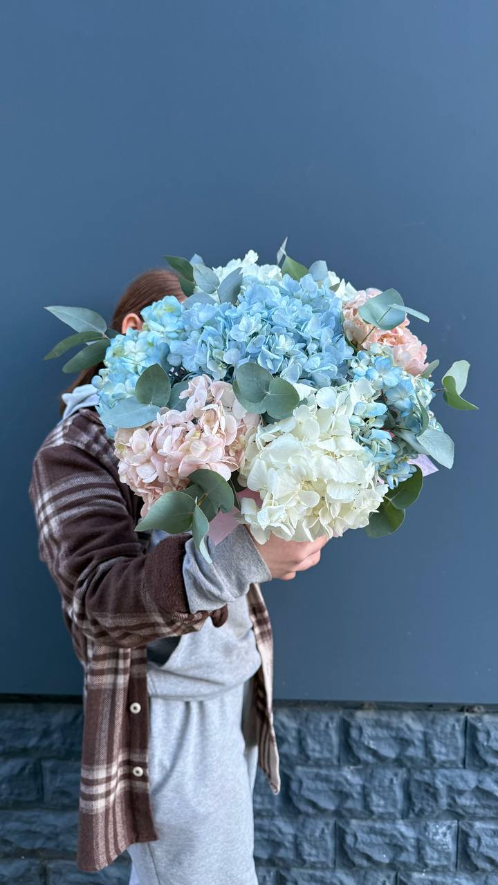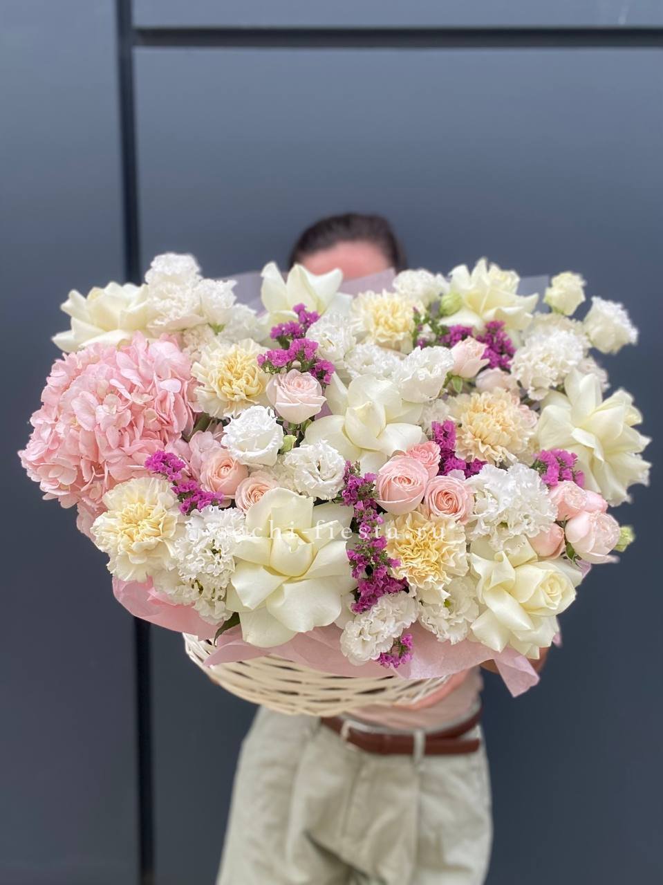 Восемь видов цветов складываются в harmonичную композицию со светлой корзиной в основе. Диантусы и эустома перекликаются с розами, а гортензия задает мягкий объем всей структуре.