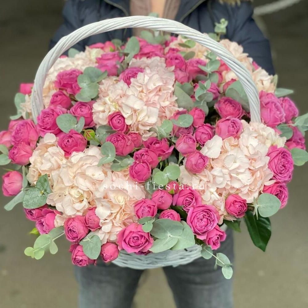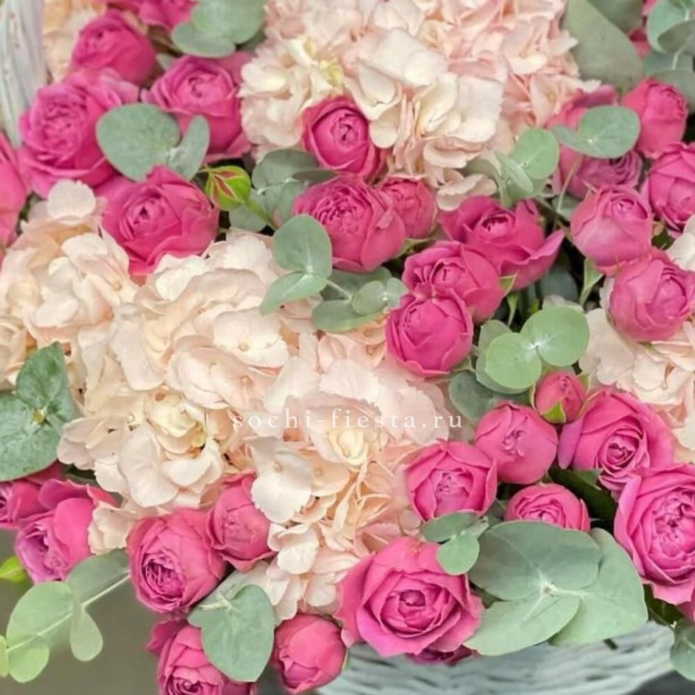 кустовые розы, одноголовые розы, диантусы, гортензия, эустома, антиринум, озатамус, хризантема, герберы, лента, светлая корзина.Состав может меняться в зависимости от сезонности.