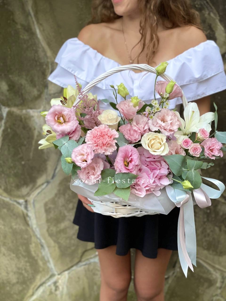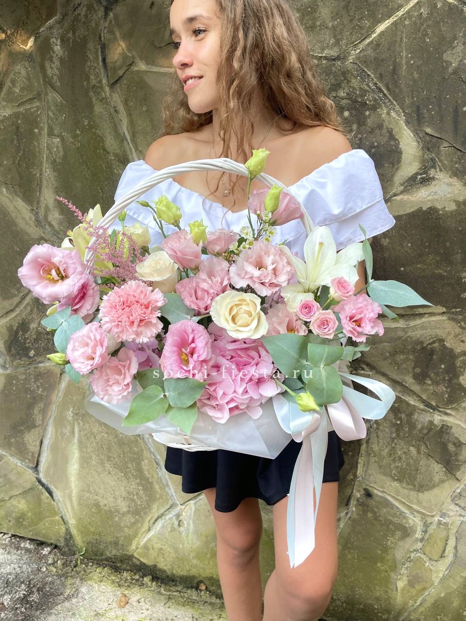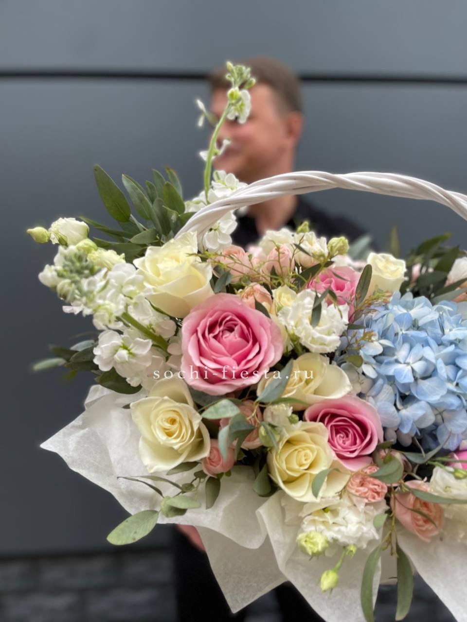 Плотная россыпь бутонов в плетеной корзине создает живописную композицию с переходами от сиреневых до пудровых оттенков. Гортензия и маттиола задают воздушный объем, а розы разной раскрытости добавляют глубину и многослойность всей картине.