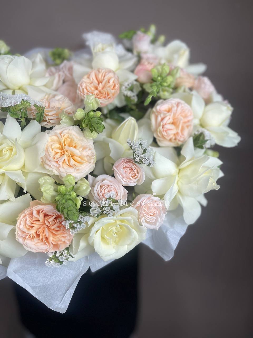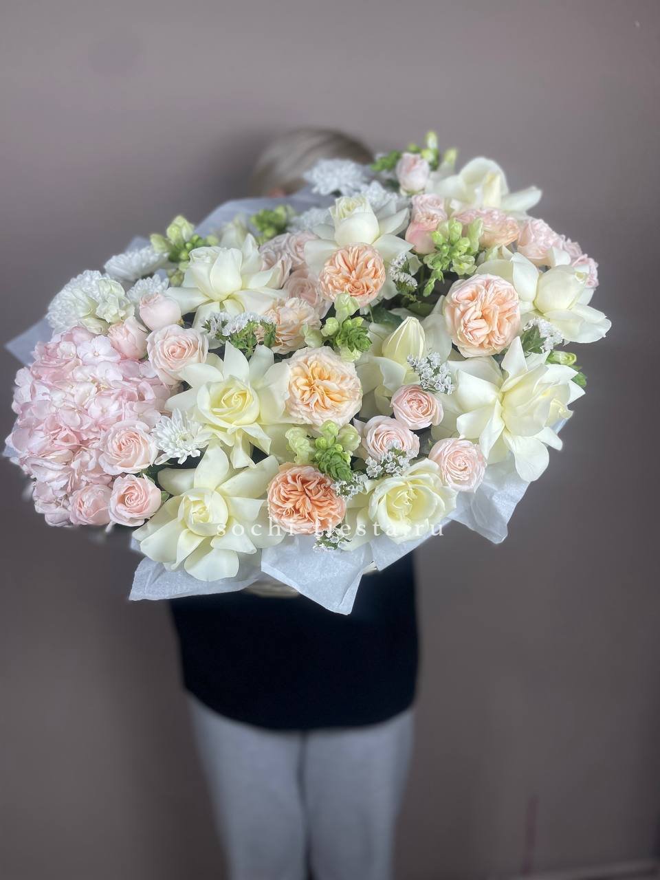 Плетёная корзина вмещает густую композицию из белых и розовых бутонов. Хризантемы и розы перемежаются с соцветиями гортензии, а статица добавляет воздушности между крупными головками цветов.