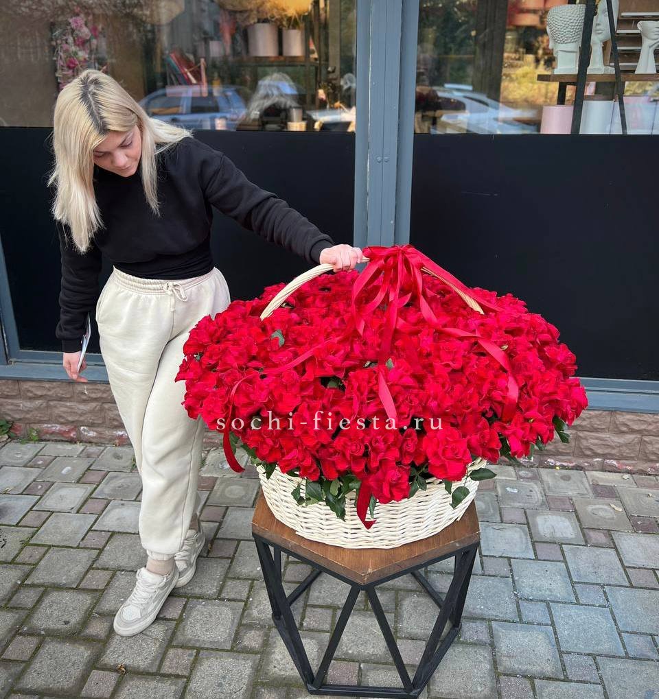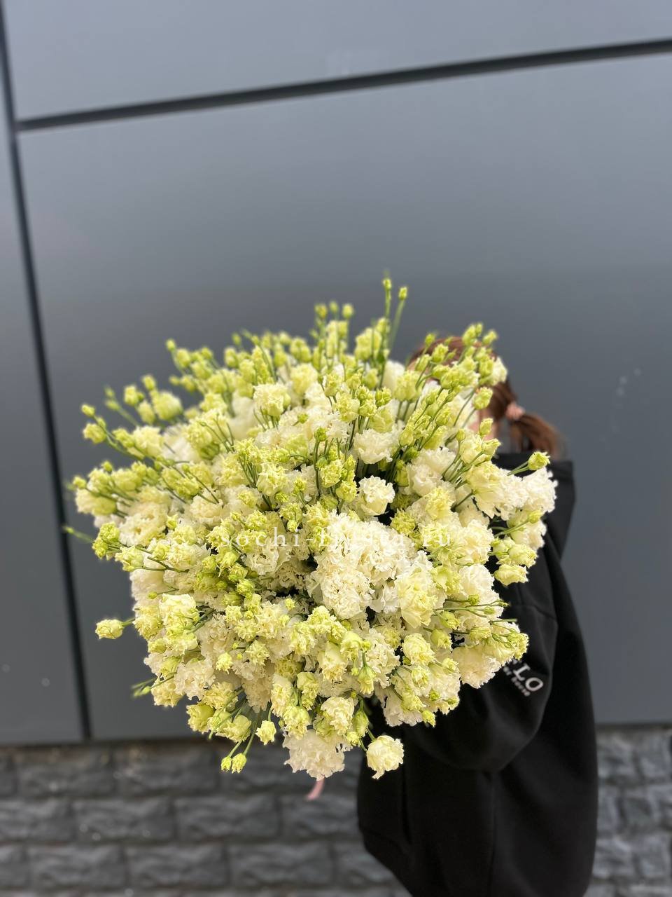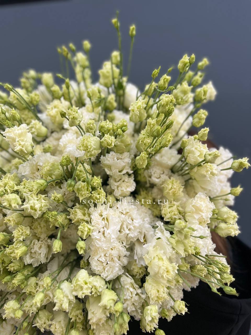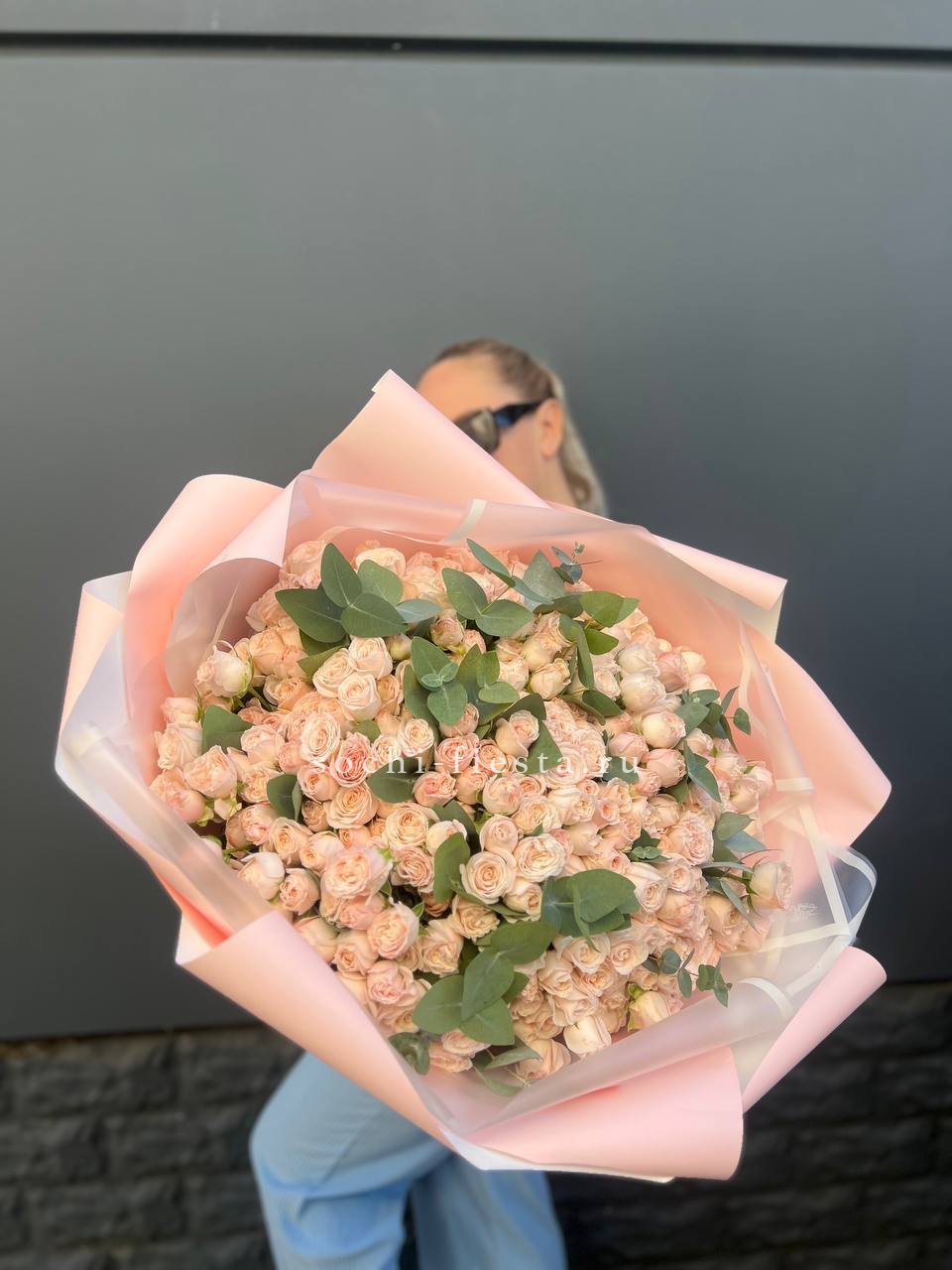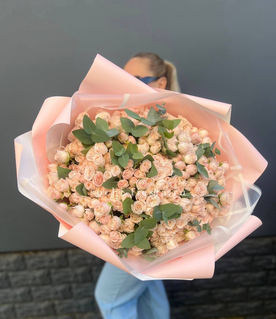 Охапка из ста одной розы – это про масштаб и драматичность момента. Белоснежные бутоны плотно собраны вместе, создавая монументальную форму. Композиция говорит сама за себя без лишних деталей.