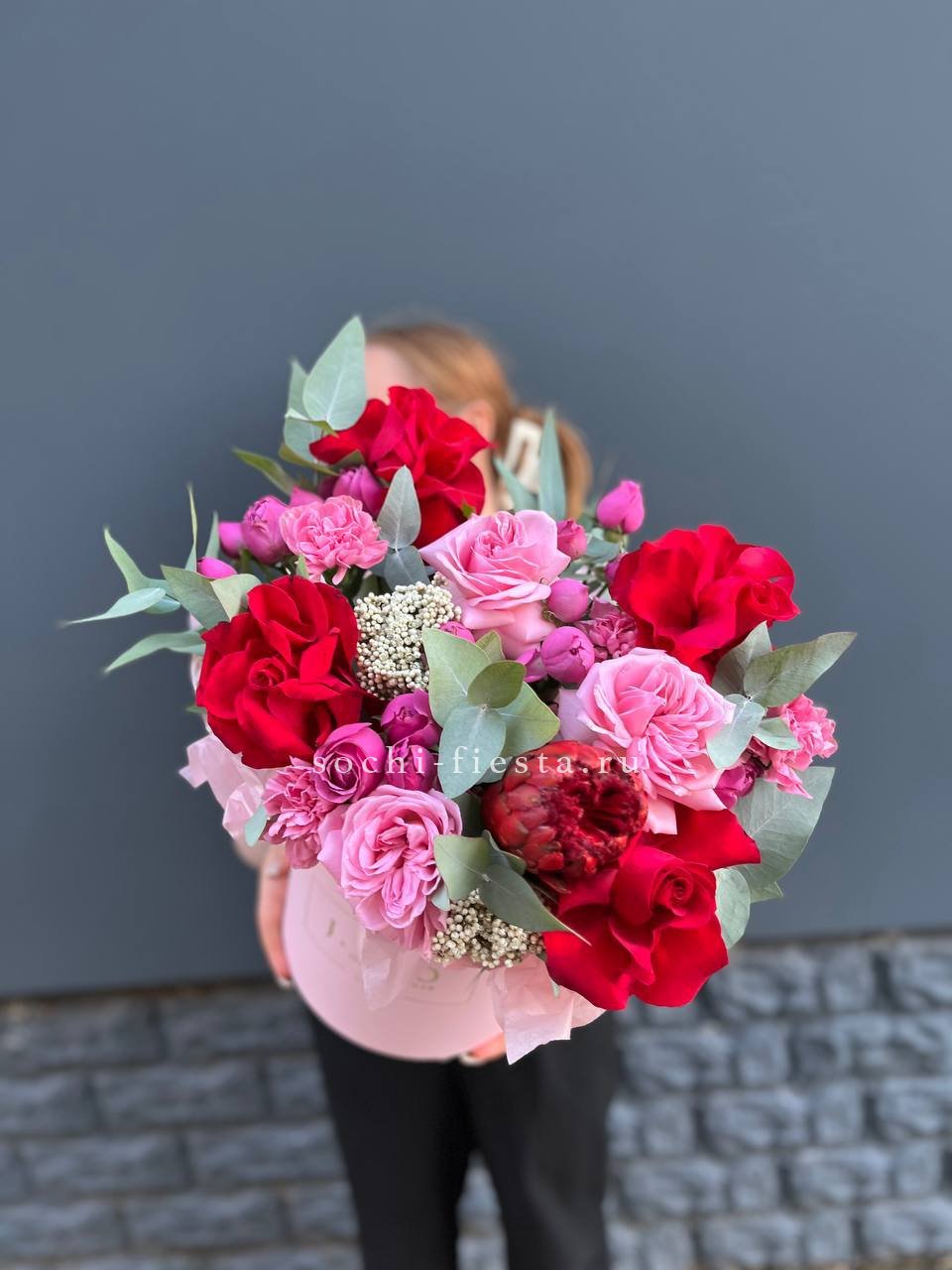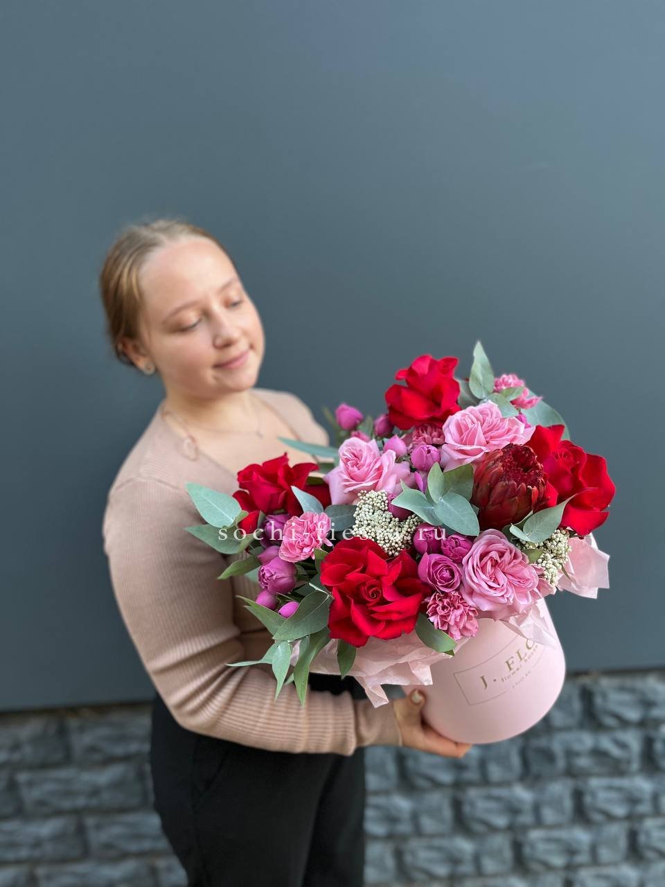 Французская надпись и место для личных слов. Плотная бумага держит форму и дополняет букет романтичным акцентом. Текст размещается на развороте аккуратным шрифтом.