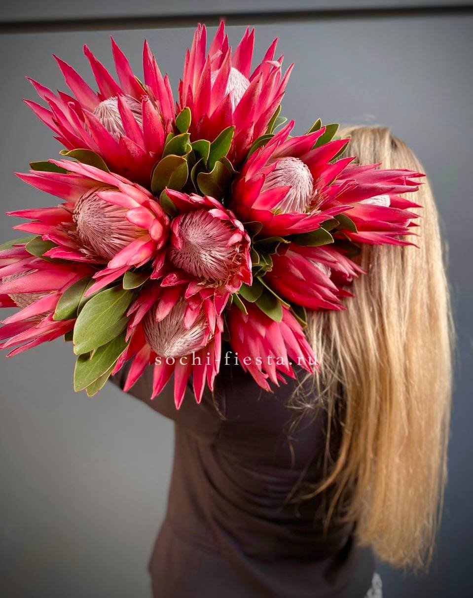 Крупные соцветия с плотными чешуйчатыми лепестками создают графичный акцент в любой композиции. Протея хороша сама по себе и эффектна в сборных букетах.