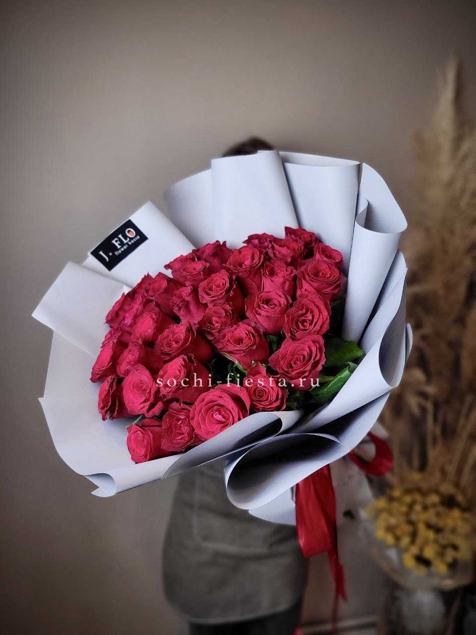 Сто один красный бутон дополнен ветками эвкалипта с серебристой листвой. Объёмная композиция занимает пространство и притягивает внимание своей масштабностью.