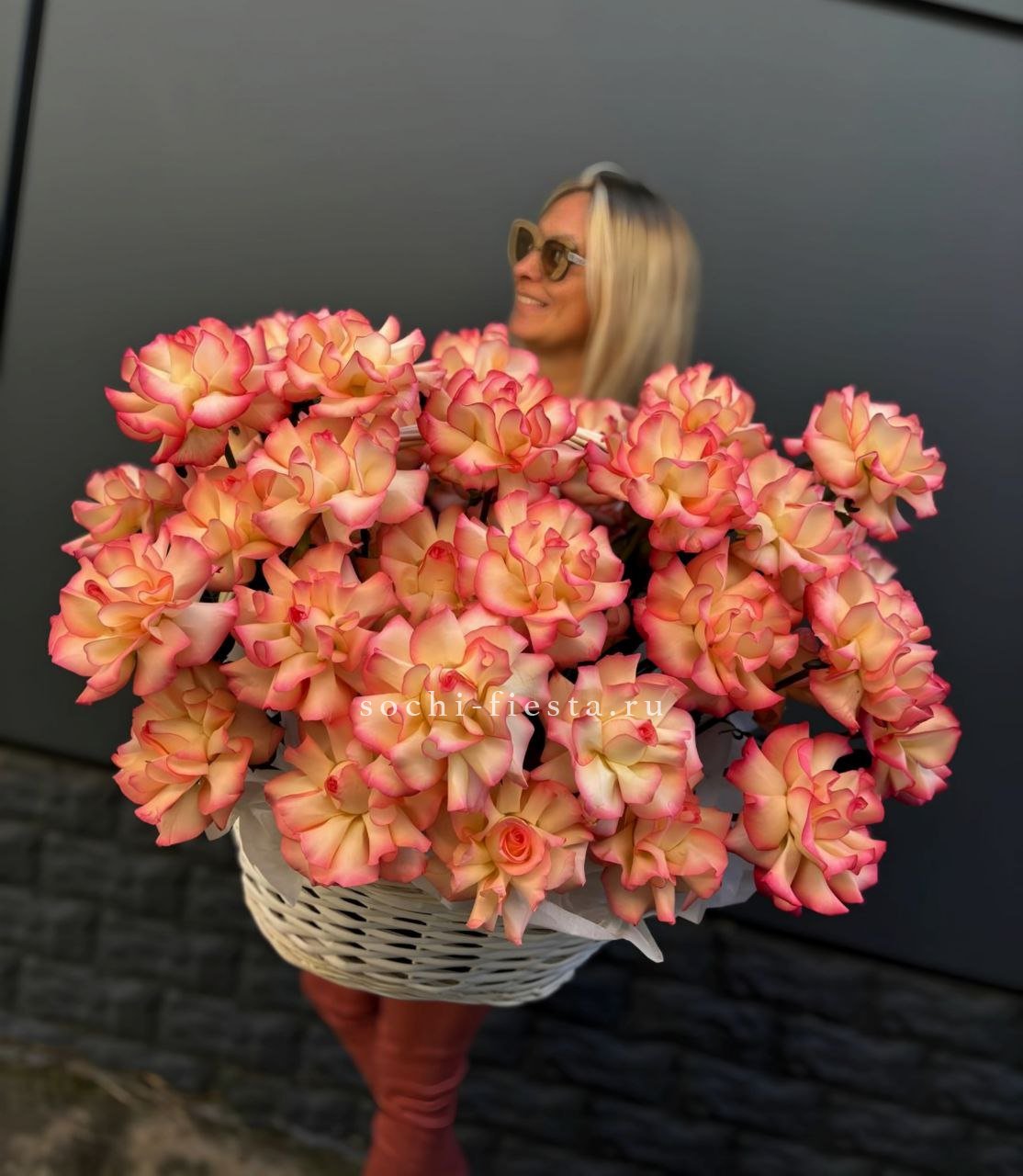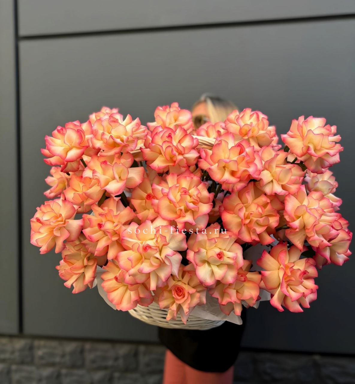 Классическая красная палитра раскрывается в композиции из двадцати пяти роз с добавлением эвкалипта. Матовая зелень оттеняет насыщенность бутонов и придает букету завершенность.