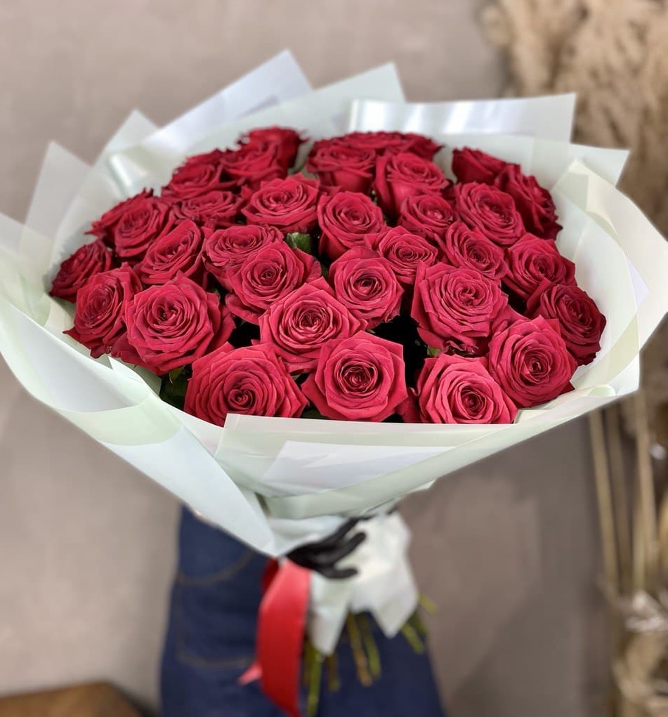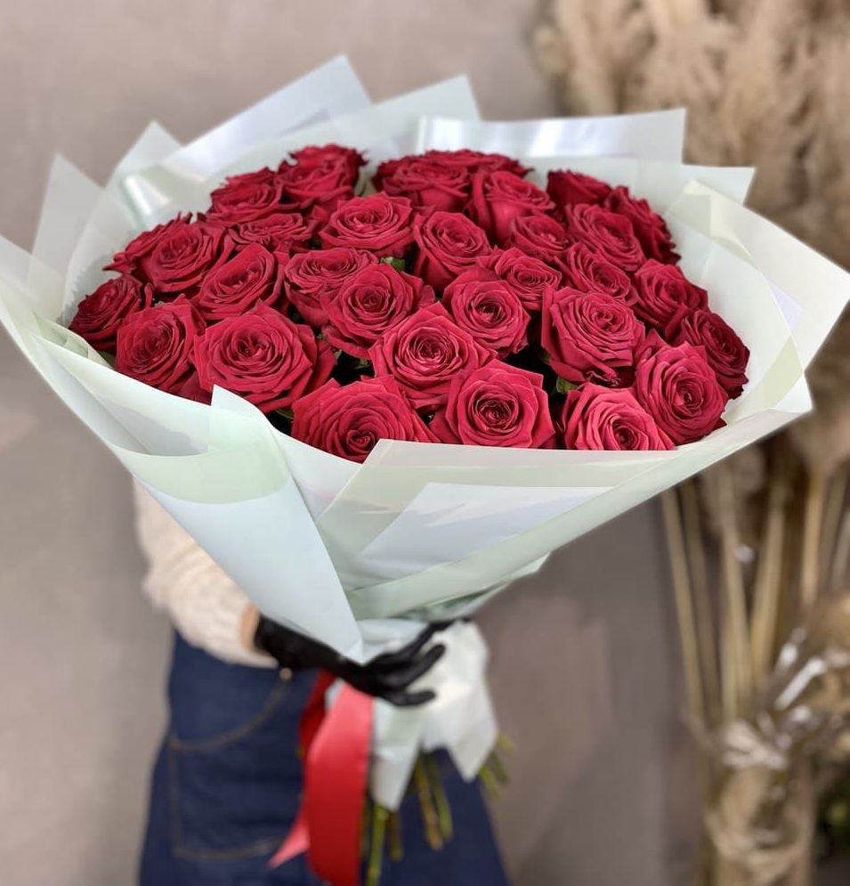 Девять роз глубокого красного цвета в комбинированной обёртке. Бутоны с плотной текстурой лепестков создают яркое визуальное присутствие и долго сохраняют свежесть.